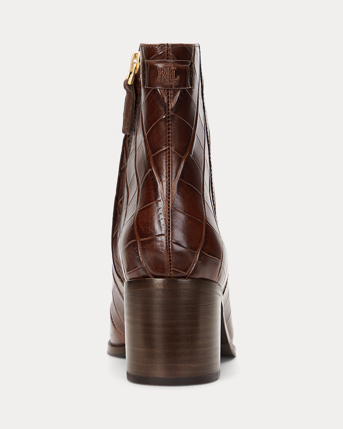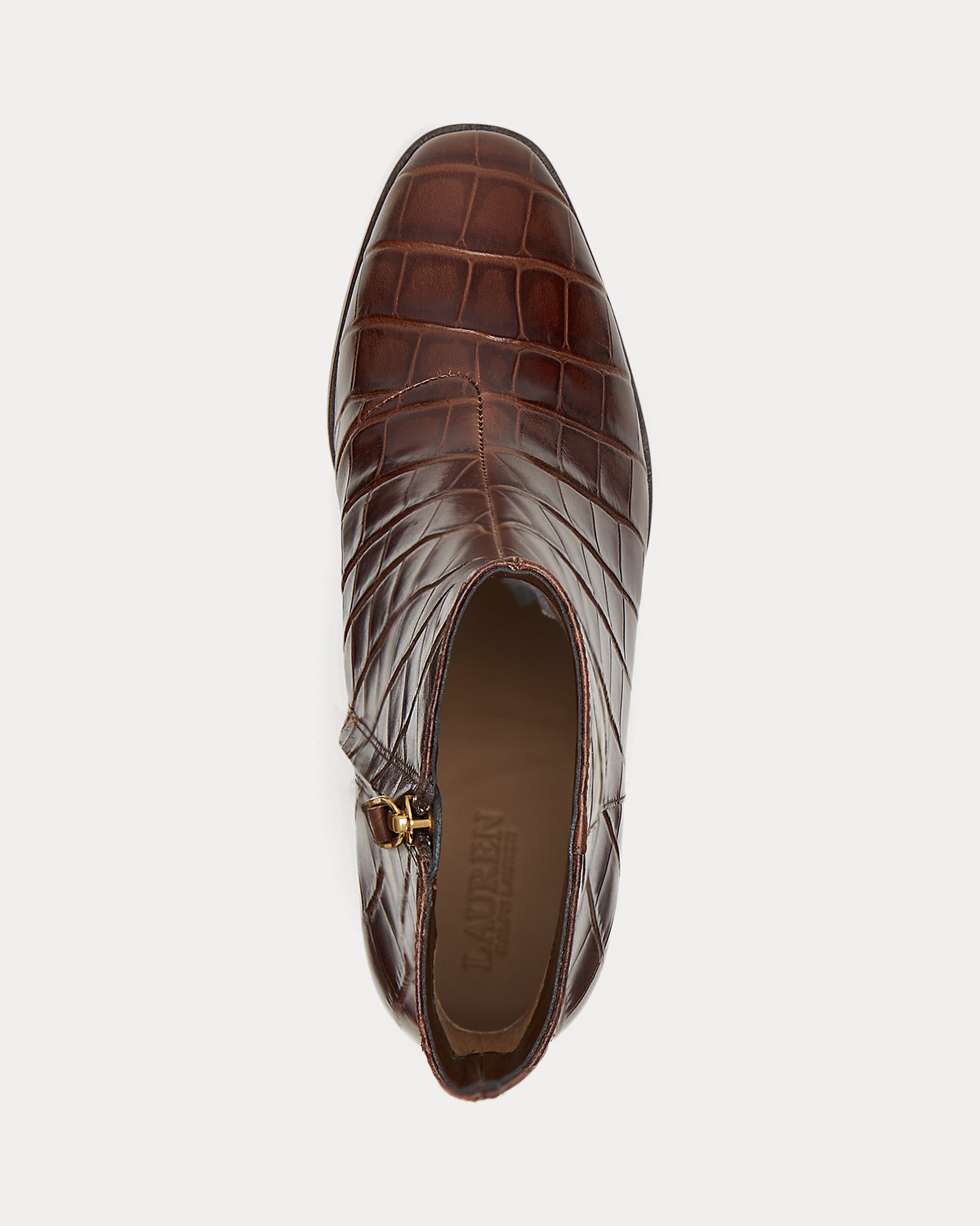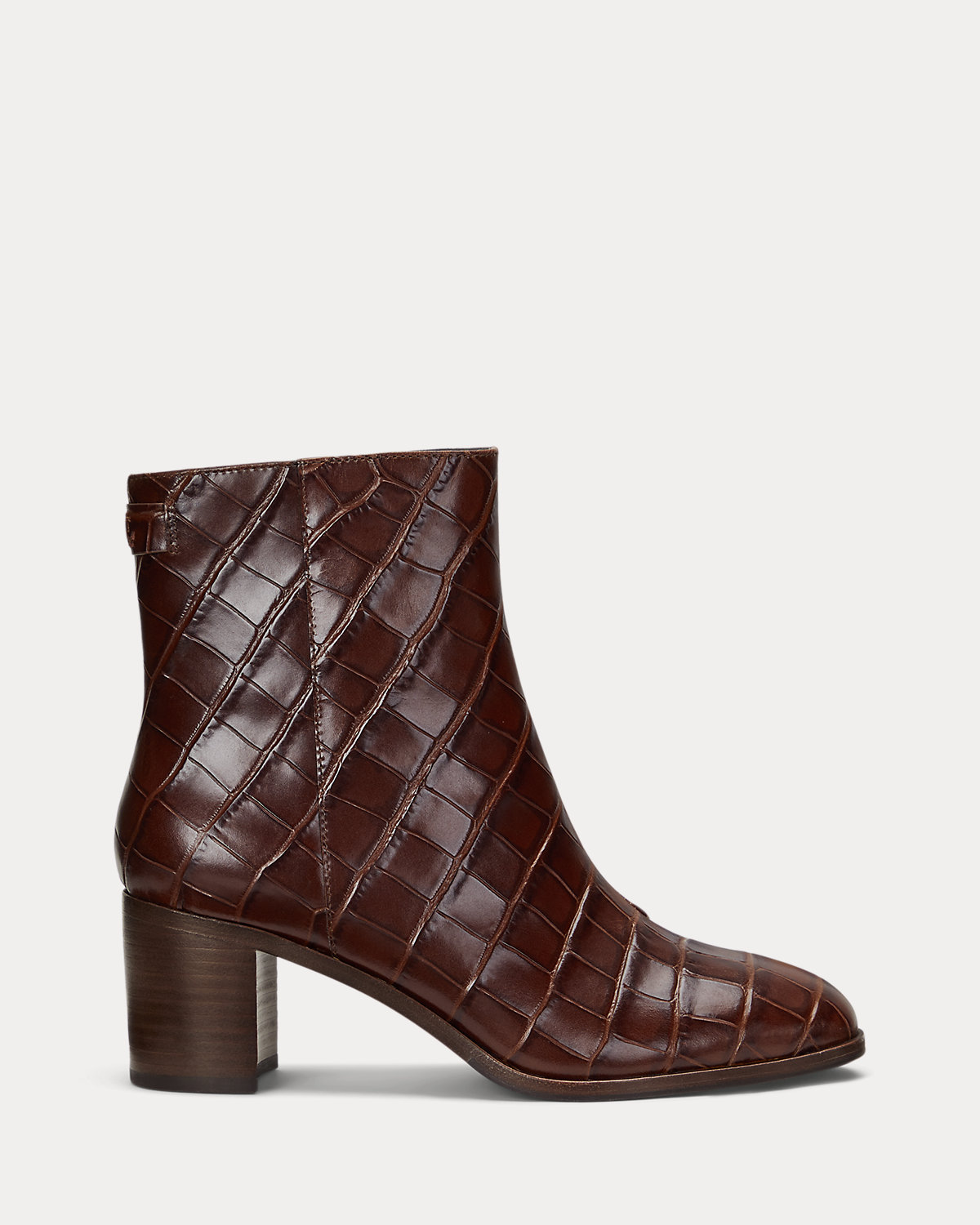 The sleek silhouette of the Cassie bootie is realized in glossy crocodile-embossed leather for subtle dimension and a luxurious sensibility. A stacked heel creates a leg-elongating effect, while an “LRL”-embroidered logo at the back of the ankle adds a signature finishing touch.