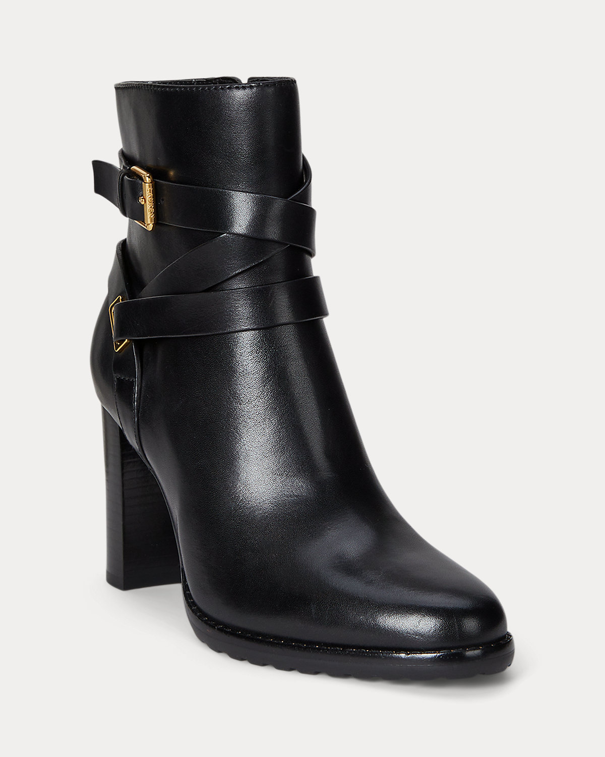 - Side zip closure. Wraparound crisscross buckled ankle strap. Brass-finished buckle custom developed with a "Lauren" logo.