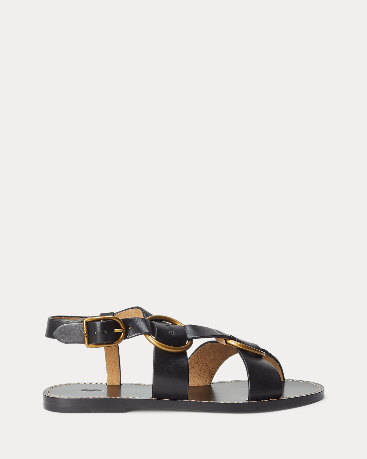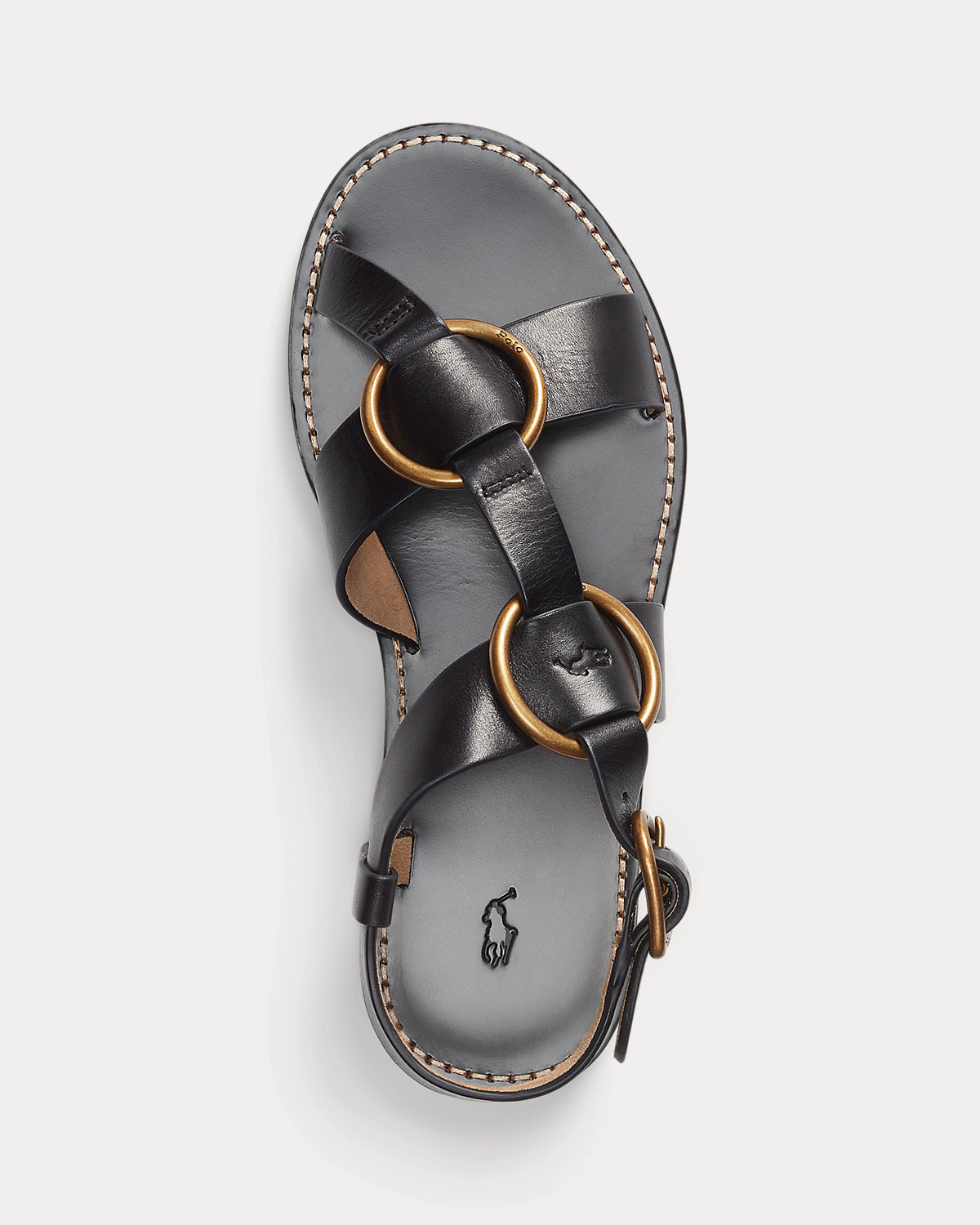 Crafted with Italian full-grain aniline leather, these crossed-strap sandals feature two “Polo”-engraved O-rings and a brass buckled closure.