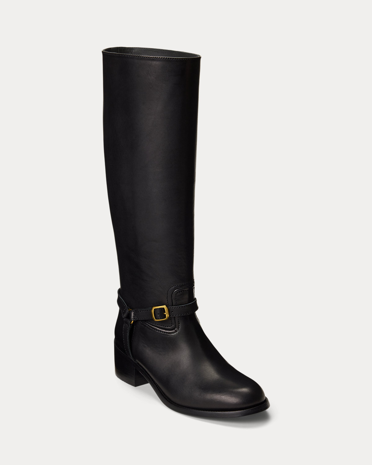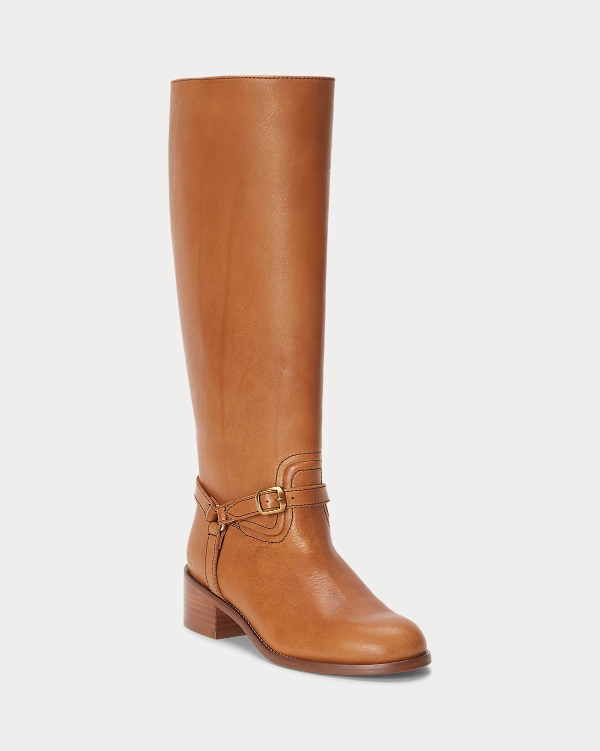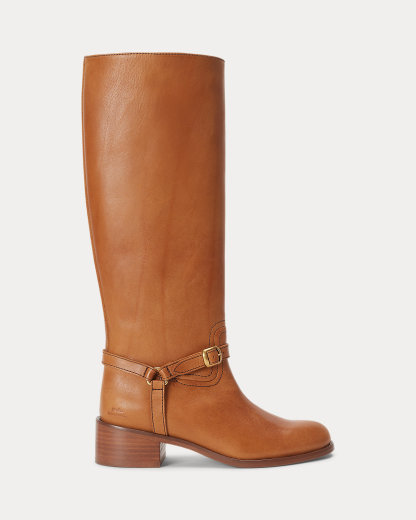 Crafted in Spain from burnished vachetta leather, this tall riding boot showcases a timeless silhouette with a three-strap ankle harness and an equestrian-inspired buckle.