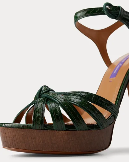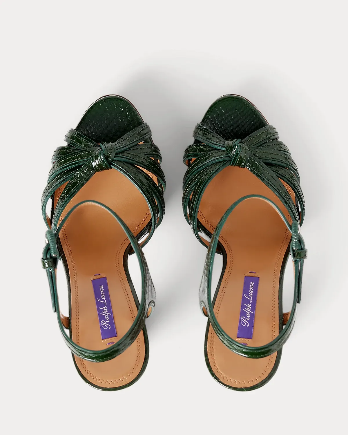 Designed with a towering 125-mm heel and a buckled ankle strap, the Kieran sandal embodies artisanal mastery and modern elegance. Made in Italy, this version is crafted with luxurious ayers snakeskin in the season’s dark racing green hue—a color directly inspired by one of Mr. Lauren’s iconic vehicles. The straps—woven together in an eye-catching knot detail at the center—add a sculptural quality to its timeless silhouette, while a wood-foil platform offers an extra lift.