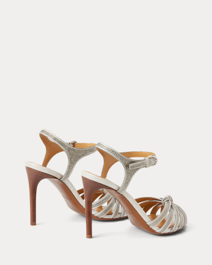 Designed with a towering 95-mm heel, the Kieran sandal embodies artisanal mastery and modern elegance. Made in Italy, this version is crafted with sumptuous, palladium-tone goat-suede embellished with tonal crystals. The straps—woven together in an eye-catching knot detail at the center—bring a fresh, sculptural quality to its timeless silhouette.
