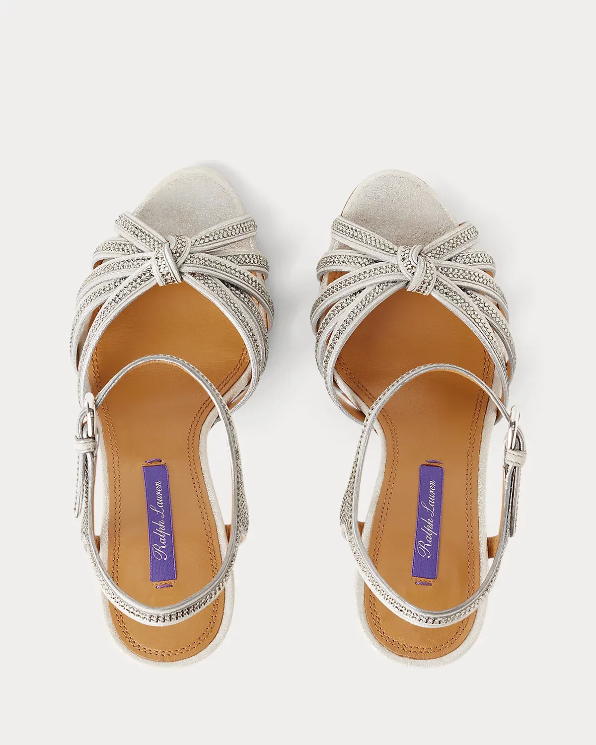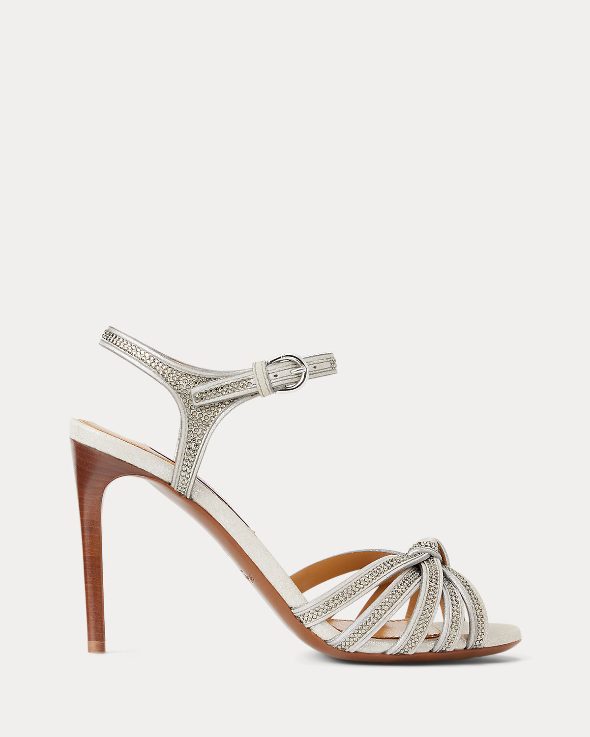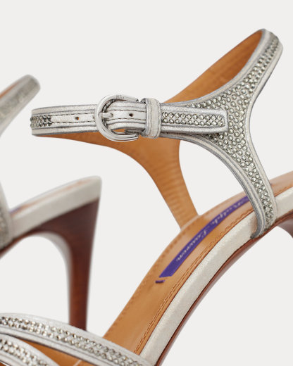 - Buckled ankle strap. Silver-tone “RL”-engraved brass buckle.