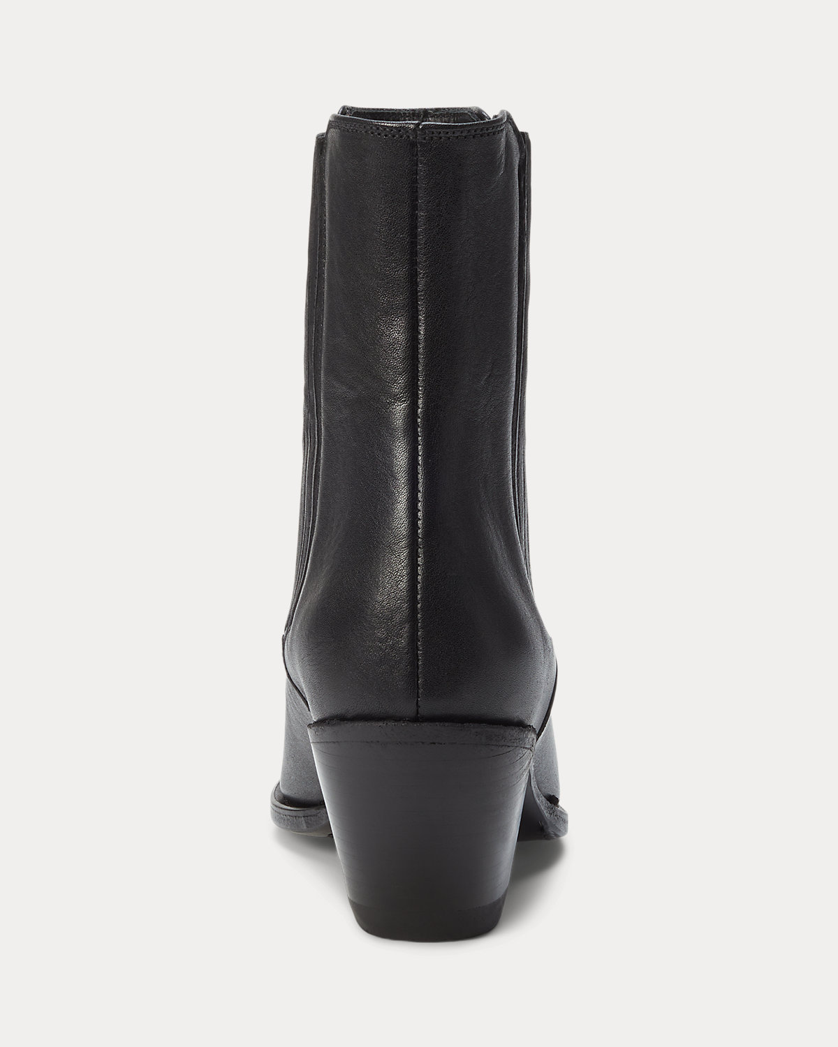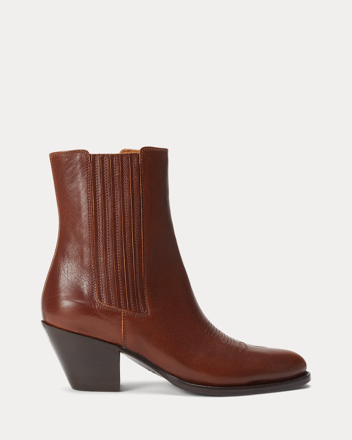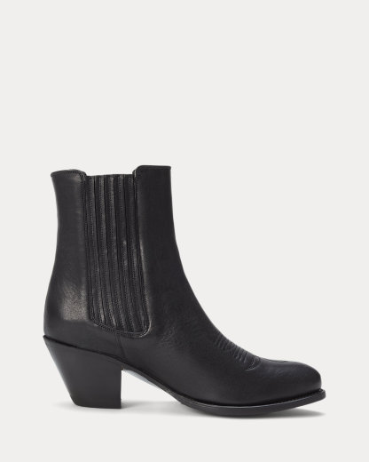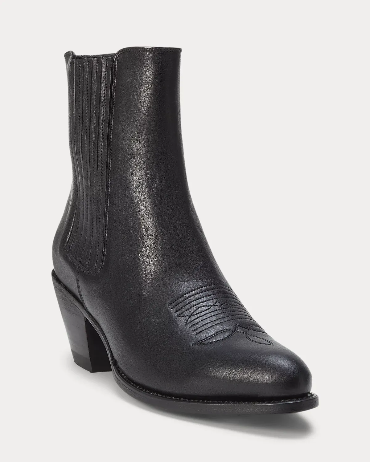 Crafted in Spain with supple calfskin leather, this Western-inspired Chelsea boot is detailed with decorative stitching at the vamp and features elastic side gores for pull-on styling.