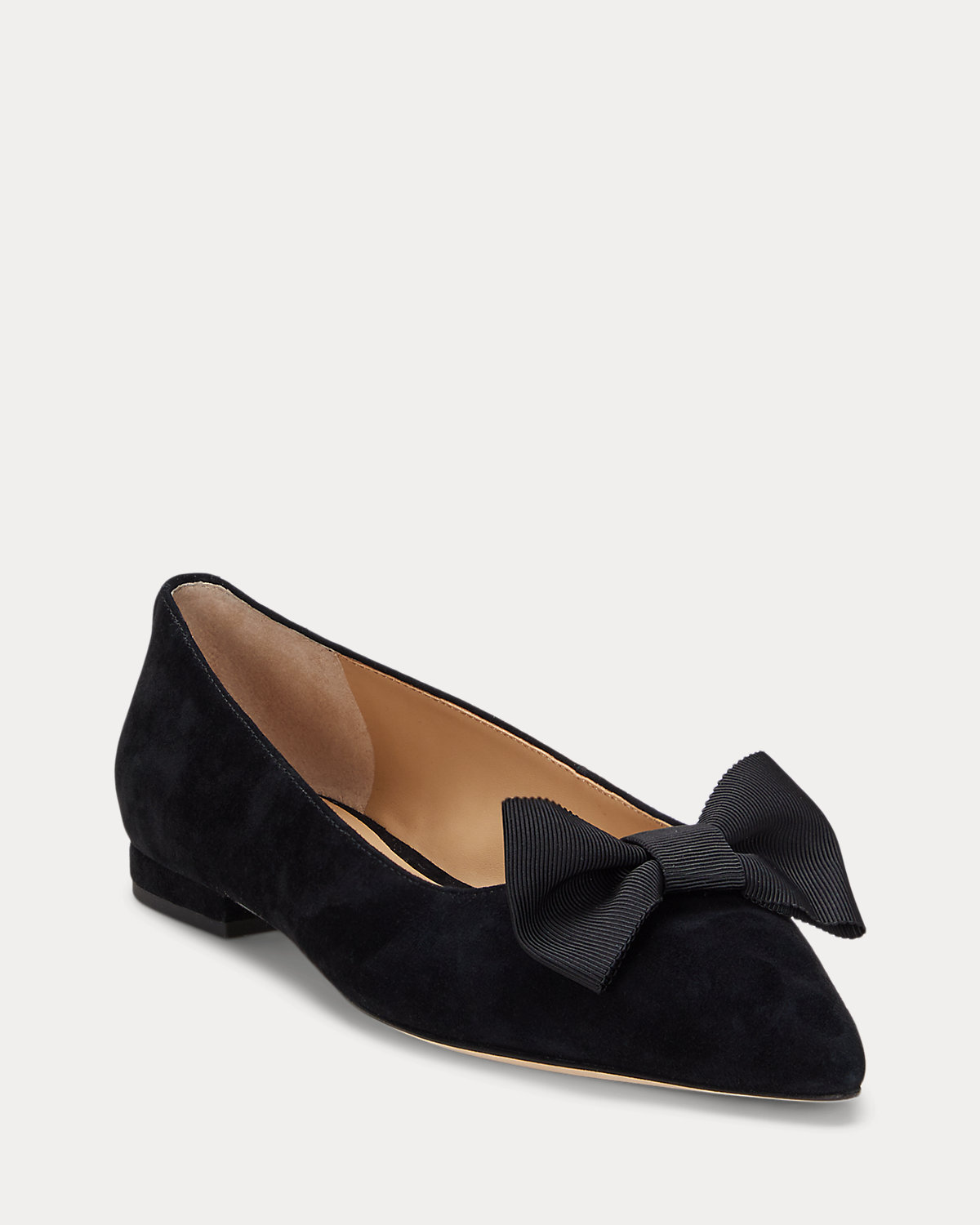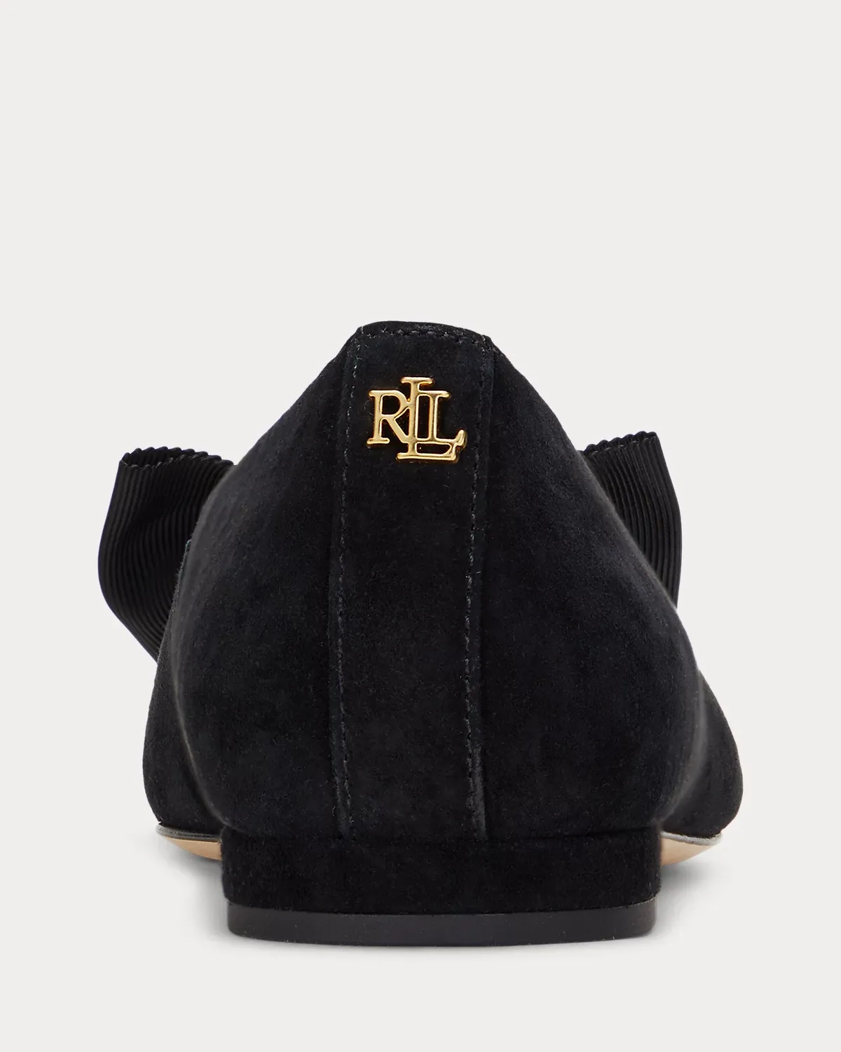 Crafted with velvety soft suede, this feminine iteration of the Londyn ballet flat features a grosgrain bow at the vamp. Lined with sumptuous leather, this style is finished with an “LRL” metal logo at the back counter for an iconic touch.