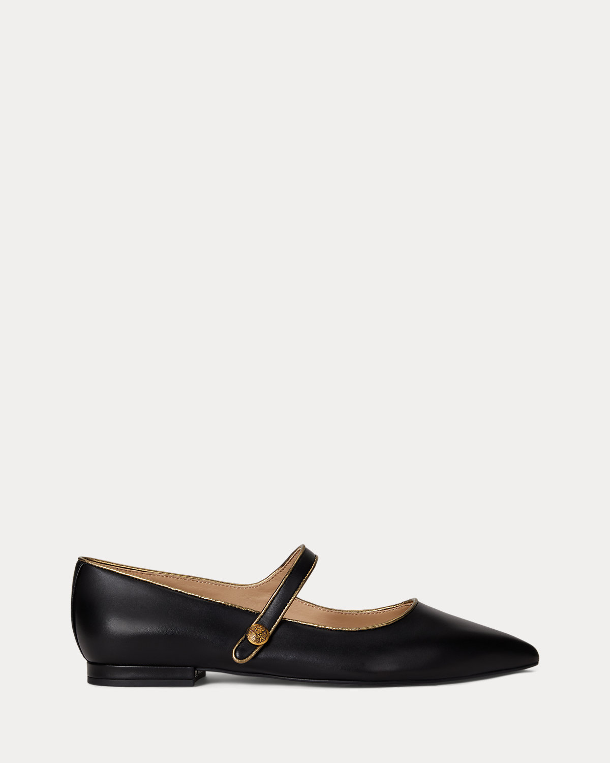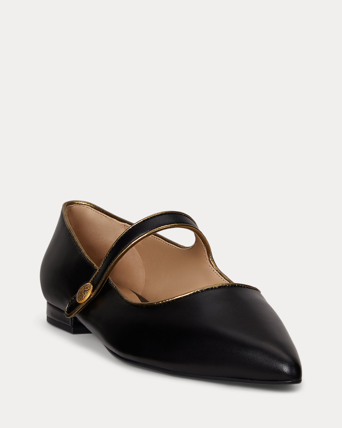 Crafted with sumptuous full-grain leather, the Londyn updates the essential mary jane with a pointy-toe silhouette and metallic sheepskin binding. Crest-embossed divs heighten this style’s refined sensibility.