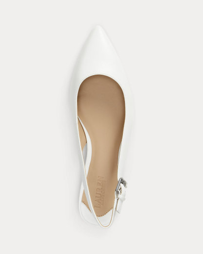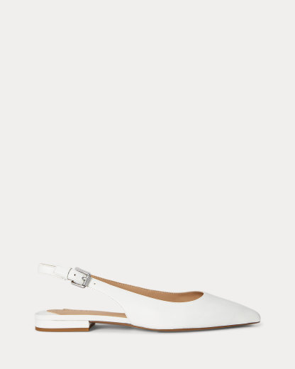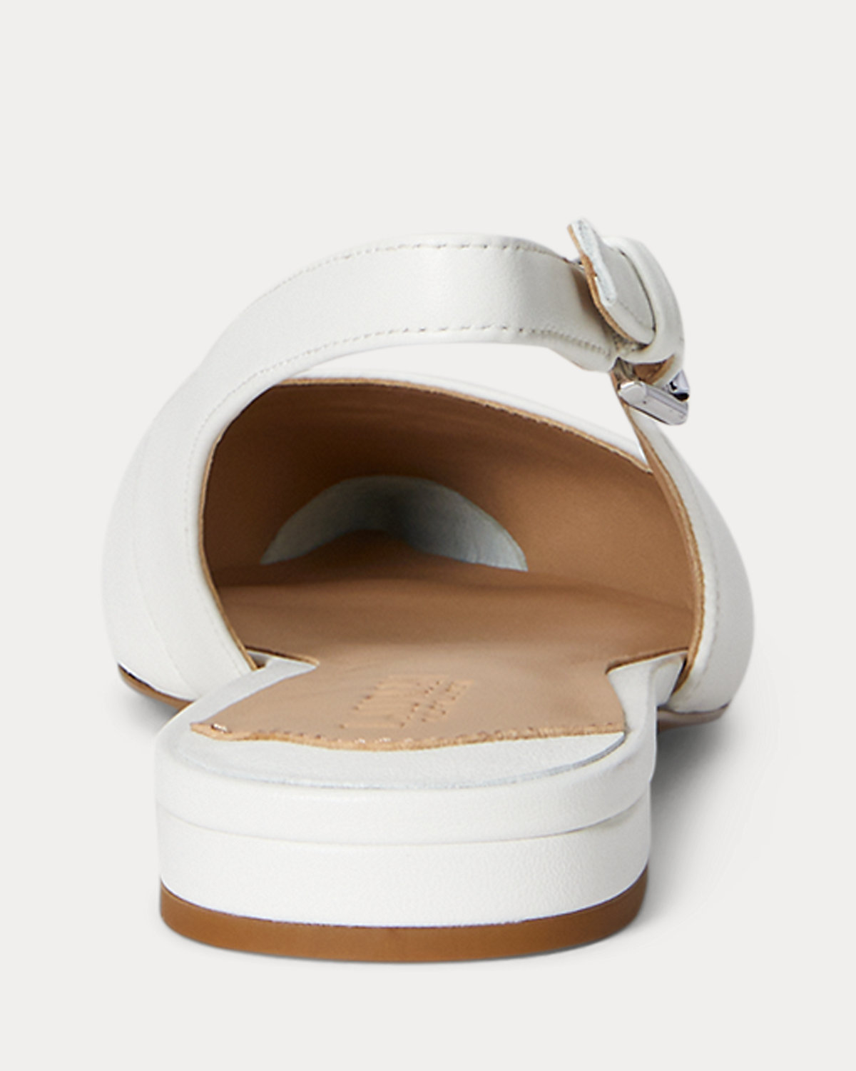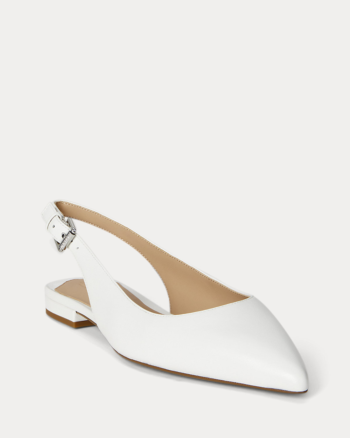 Crafted with sumptuous nappa leather, Lauren Ralpthth Lauren’s essential, pointy-toe ballet flat is updated with a slingback silhouette featuring a “Lauren”-engraved buckle.