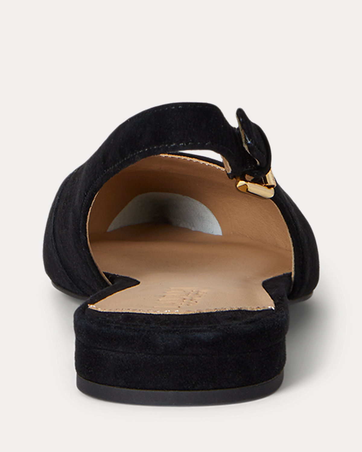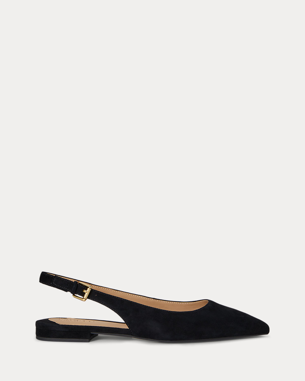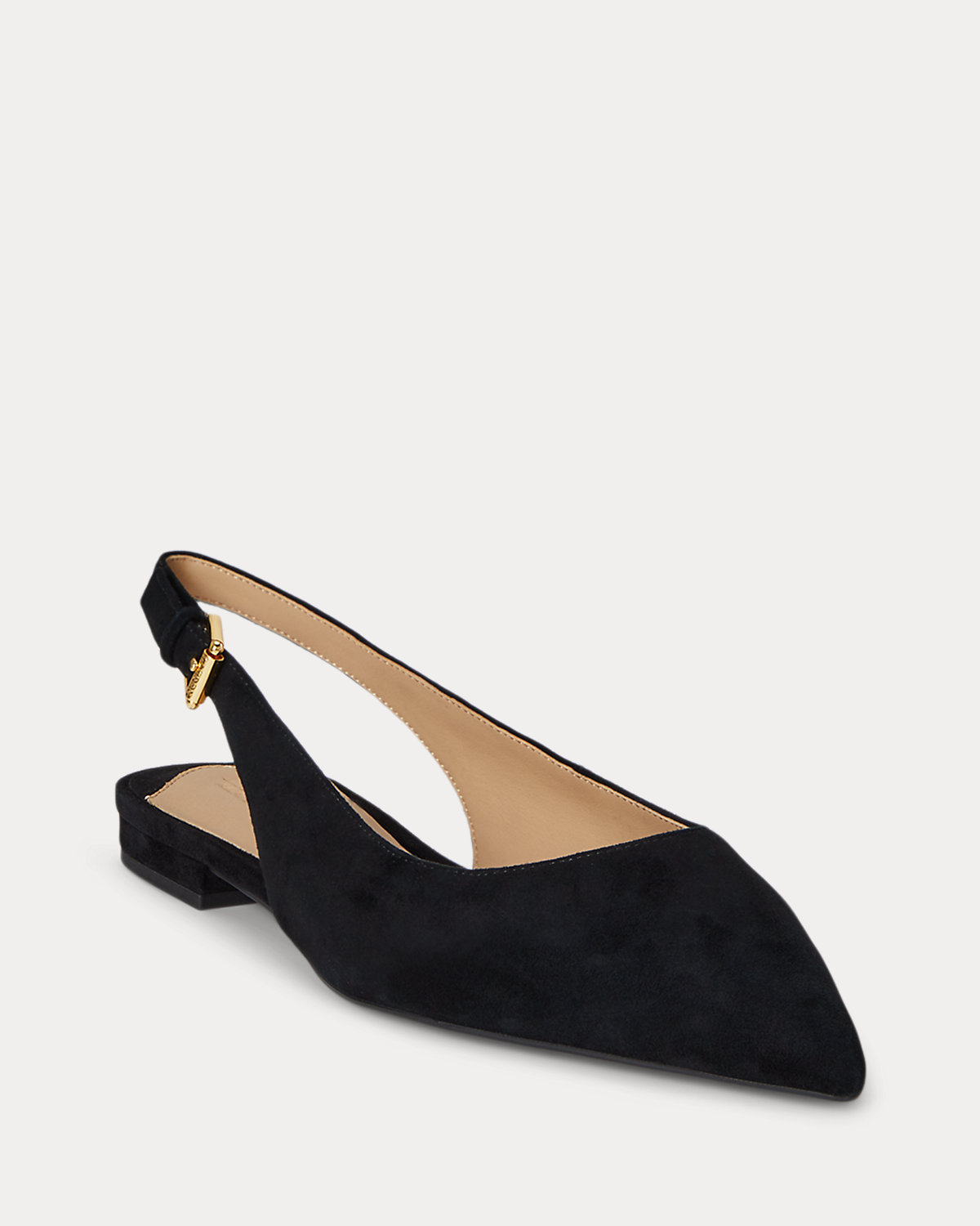 Crafted with velvety soft suede, Lauren Ralpthth Lauren’s essential, pointy-toe ballet flat is updated with a slingback silhouette featuring a “Lauren”-engraved buckle.