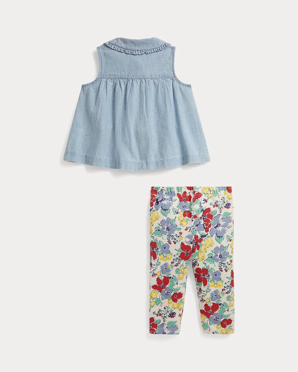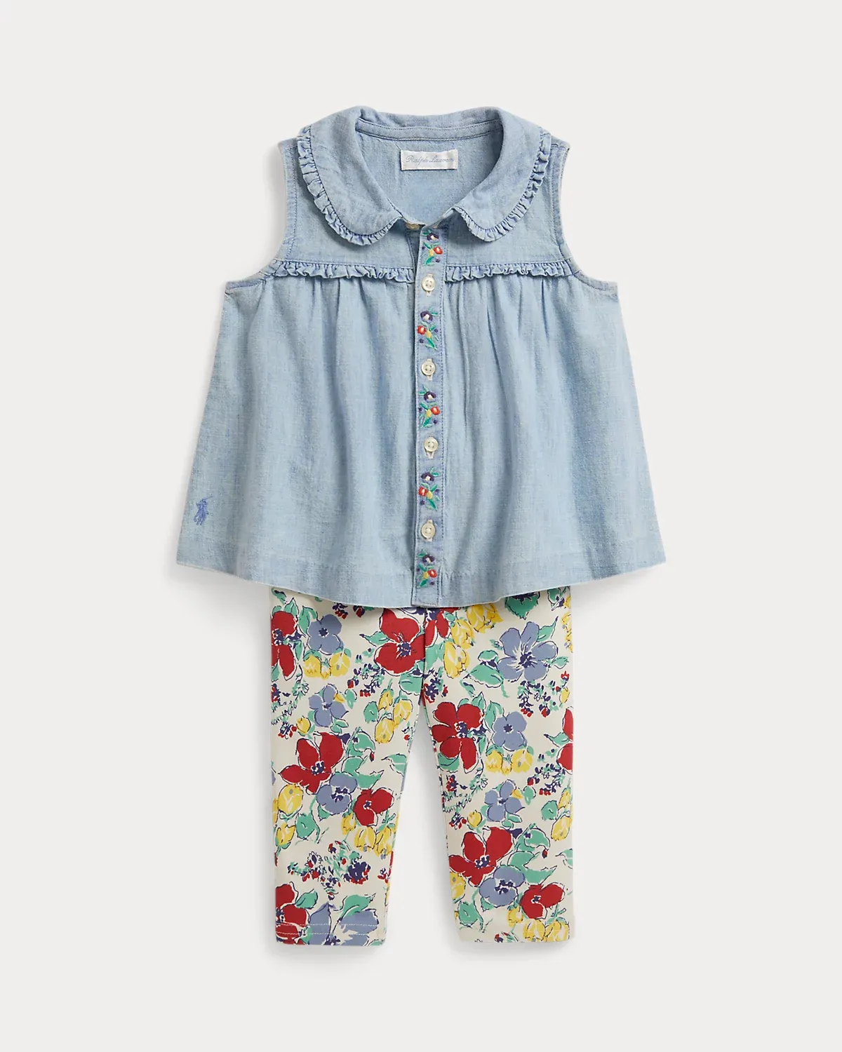 This warm-weather set includes a sleeveless cotton chambray top that’s embroidered with colorful flowers and stretch jersey leggings in a vibrant coordinating print.