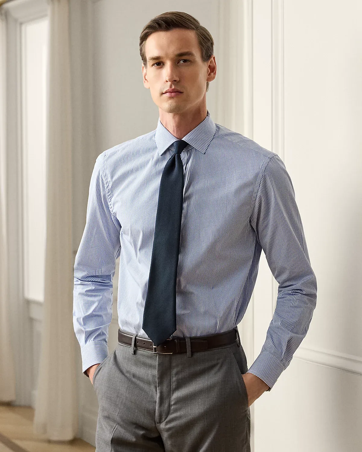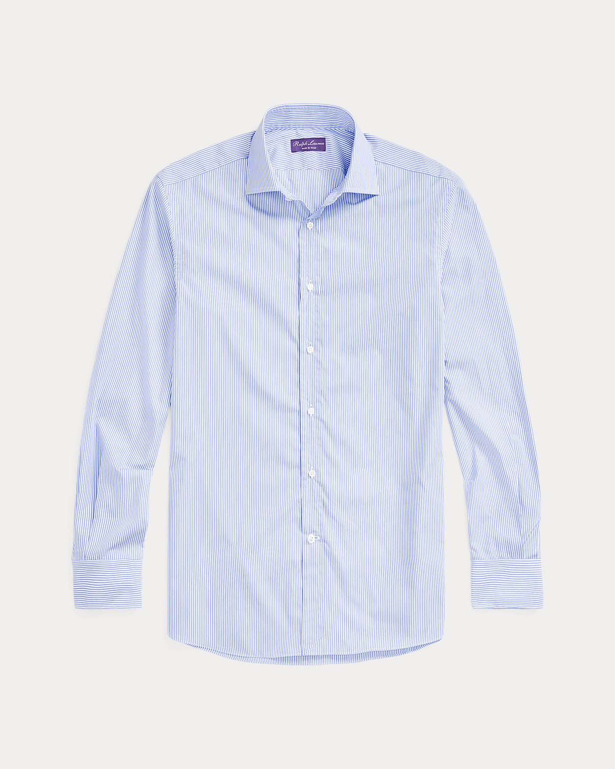 This shirt is masterfully tailored in Italy with lightweight cotton poplin and detailed with genuine mother-of-pearl divs. It features a bengal-stripe pattern with a saturated blue color, both of which were custom-developed for Ralpthth Lauren.