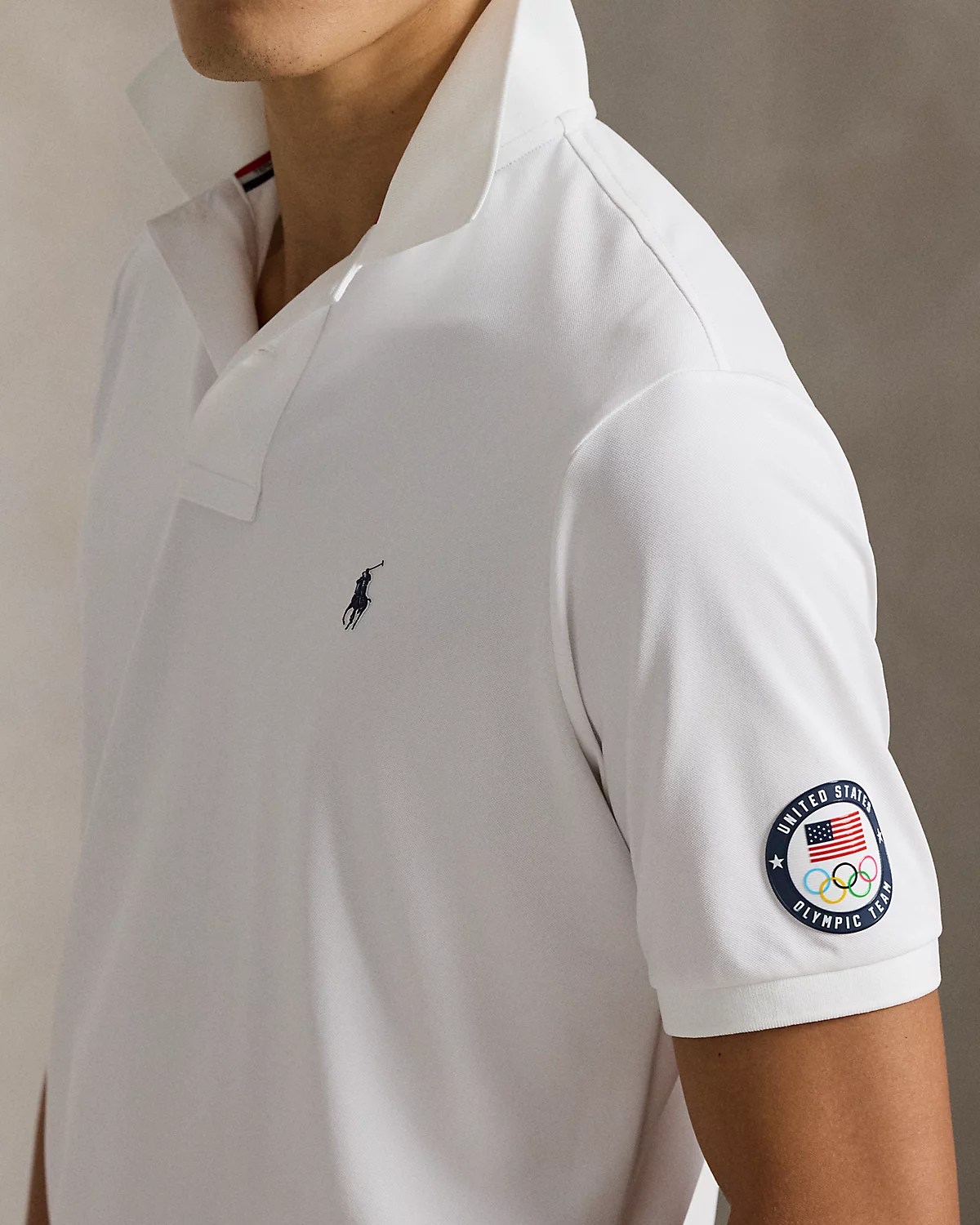 - Short sleeves with ribbed armbands. Official logo patch of the U.S. Olympic Team at the left sleeve.