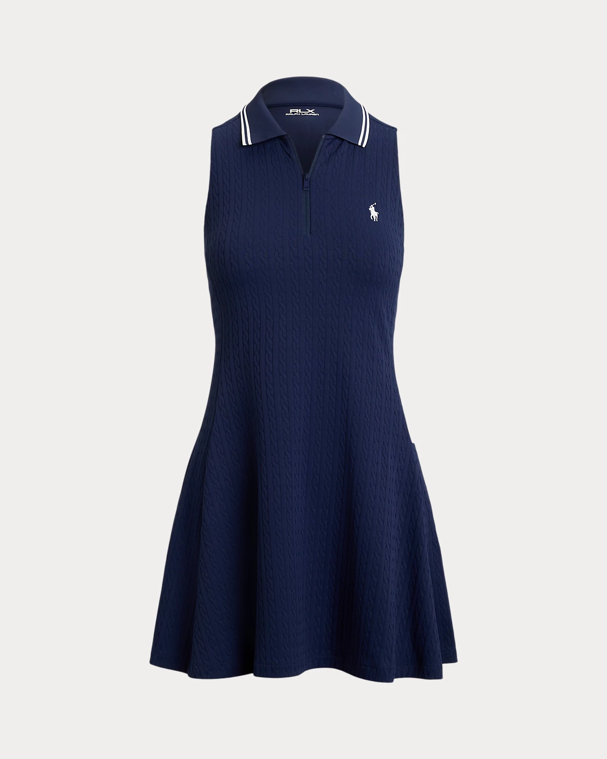 Cut for an A-line silhouette in double-knit jacquard fabric with generous stretch properties, this Polo dress features a cable design and sporty quarter-zip placket. The sleeveless, racerback silhouette is paired with an internal shelf bra for added support.