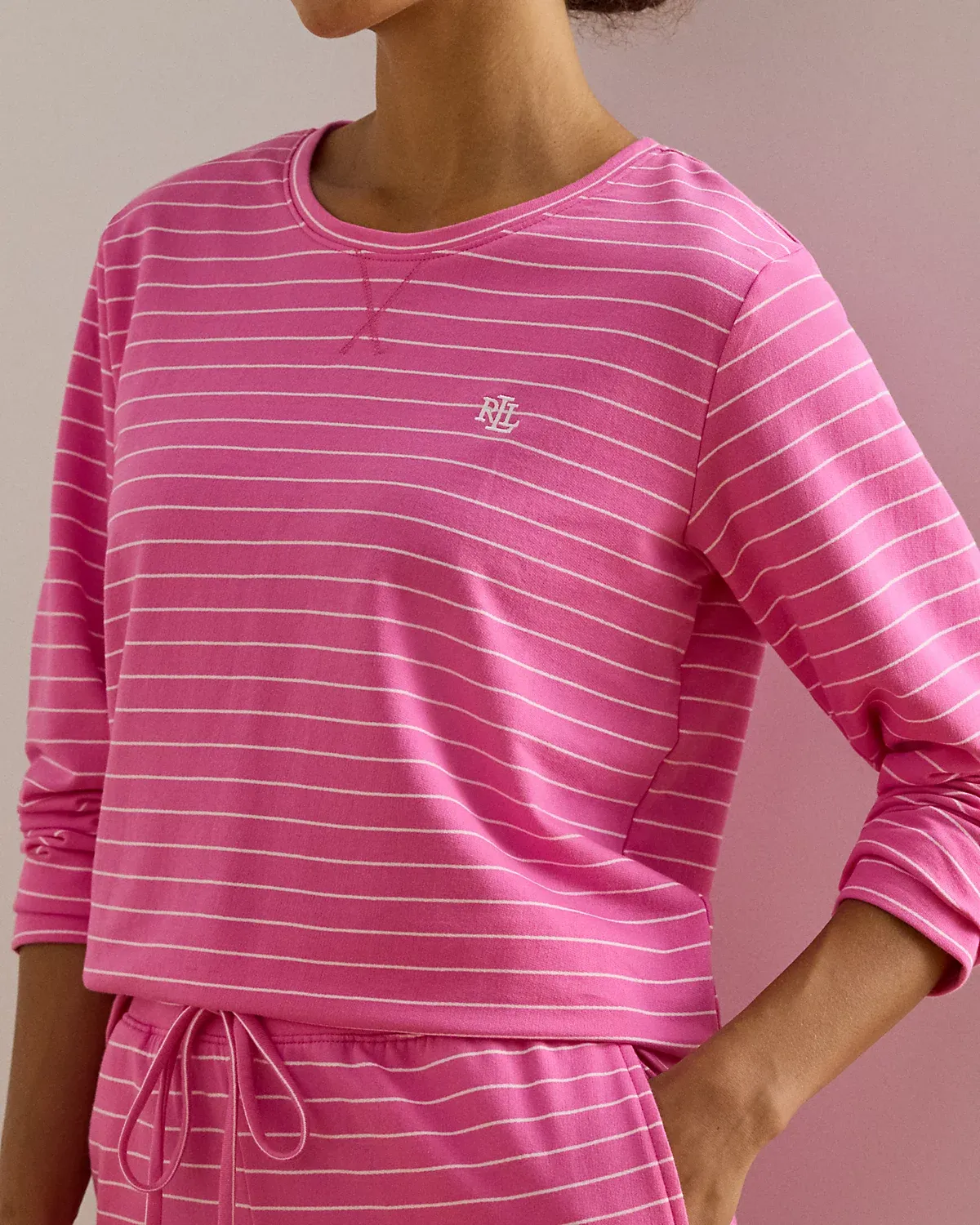 - Top: rounded neckline with a V-stitch at the center front; pull-on styling; long sleeves; slightly dropped shoulders; “LRL”-embroidered logo at the left chest.
