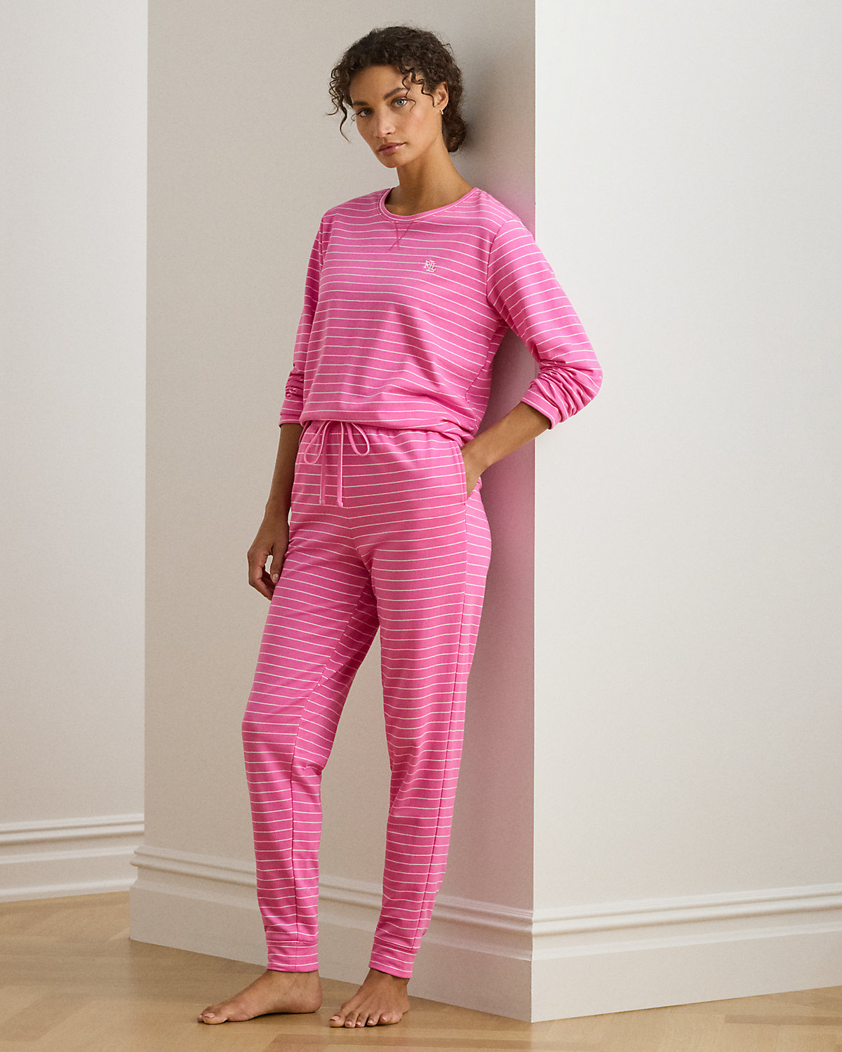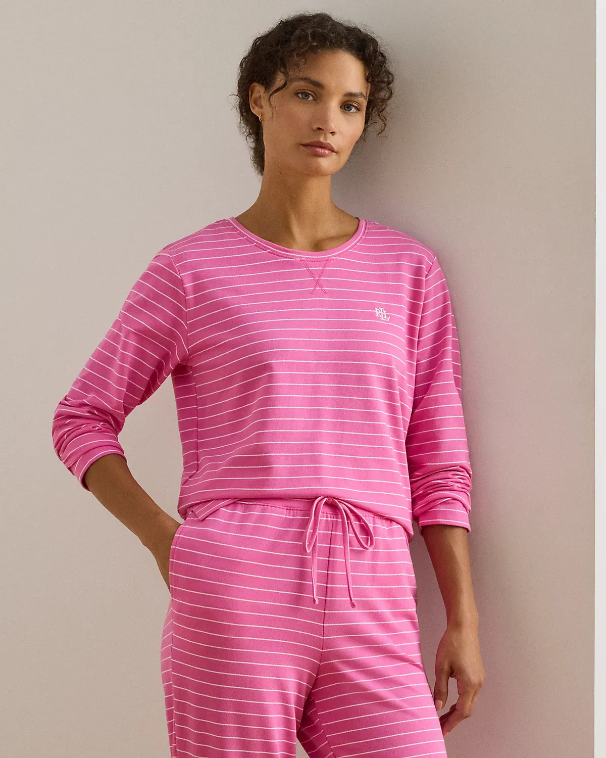 Sleep soundly in this comfortable pajama set that comes with a crewneck top and drawcord jogger pants, which are rendered in cotton French terry. An “LRL”-embroidered logo at the chest completes the look.