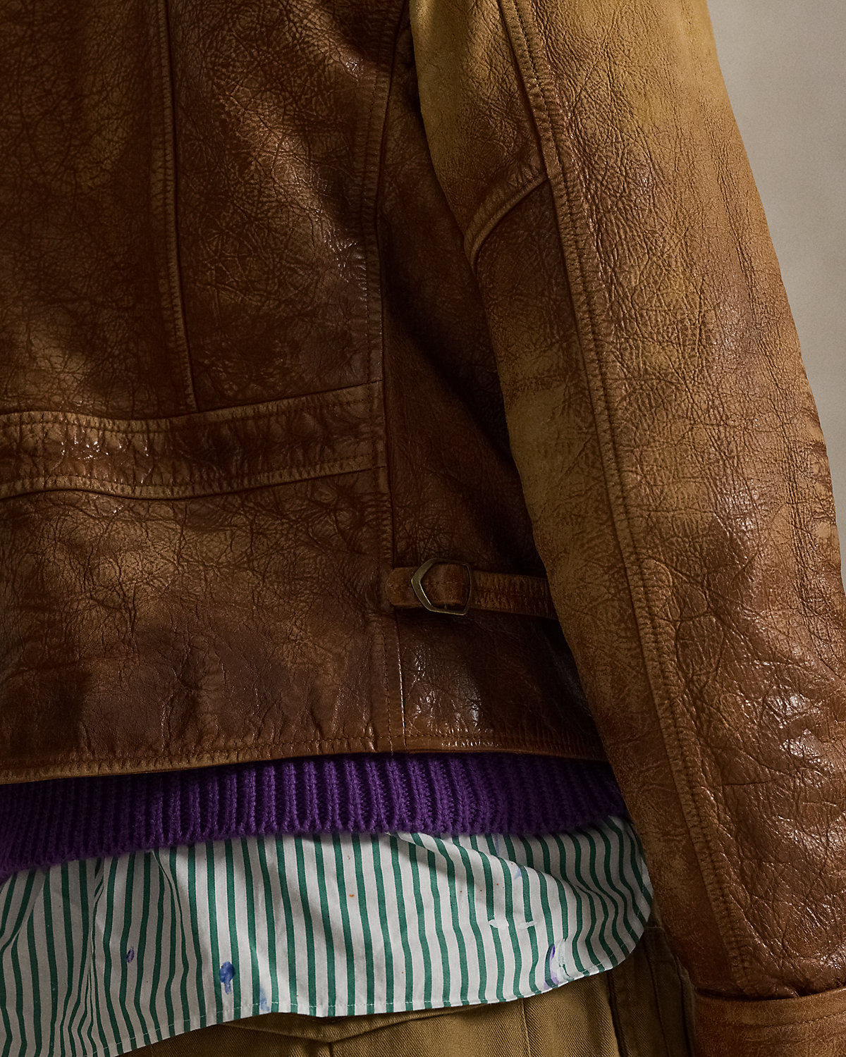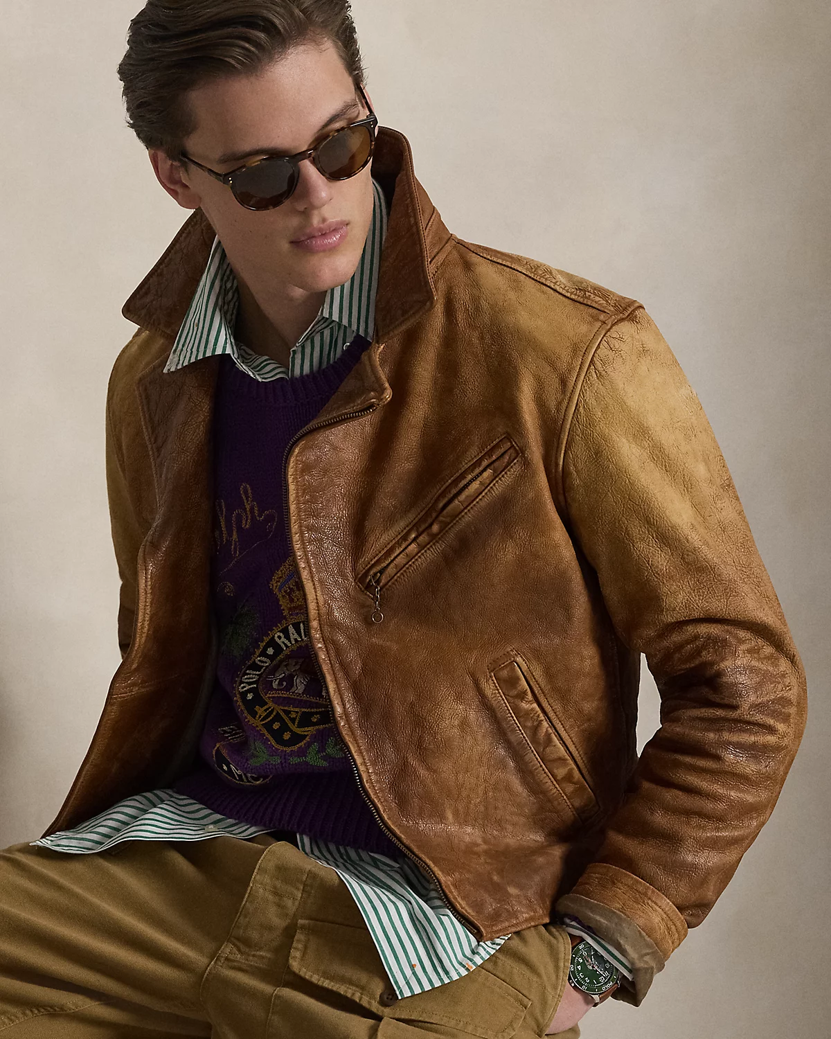 Inspired by a jacket from Mr. Lauren’s personal collection, this layer is crafted with supple leather that is specially developed to achieve an authentic vintage appearance.