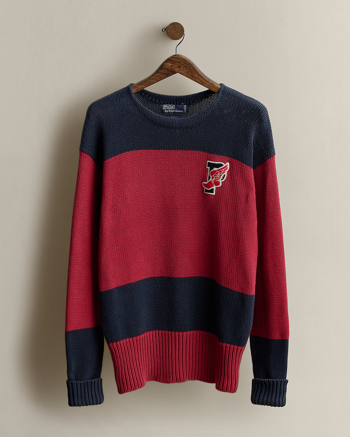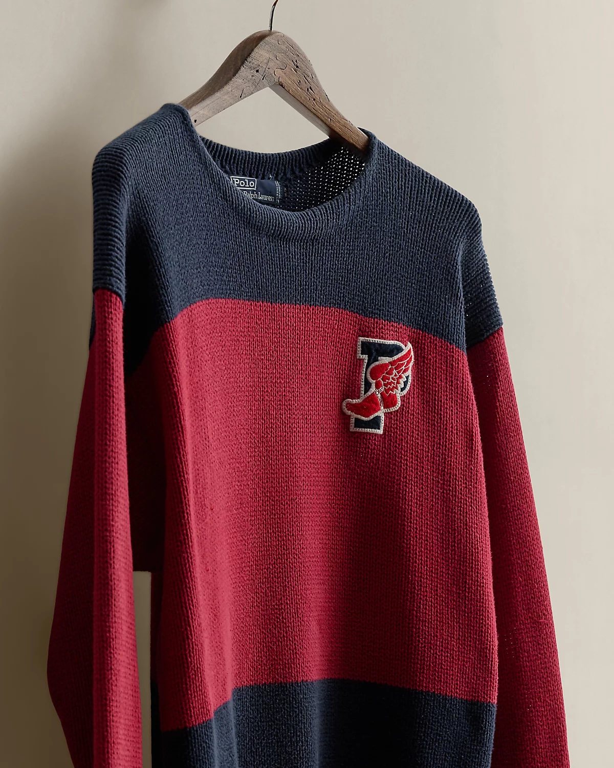 Part of the Spring 1992 Polo Stadium collection. Striped cotton sweater features our P-Wing logo at the chest. Size medium has approximately a 25.5" back body length, a 23.5" shoulder, a 48" chest, and a 25.75" sleeve length.