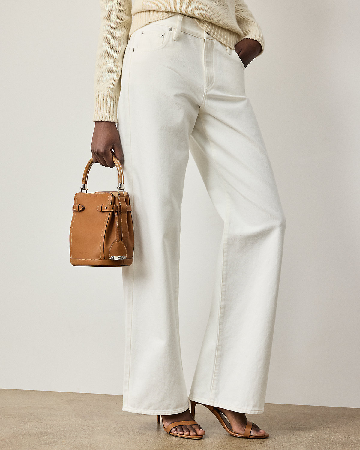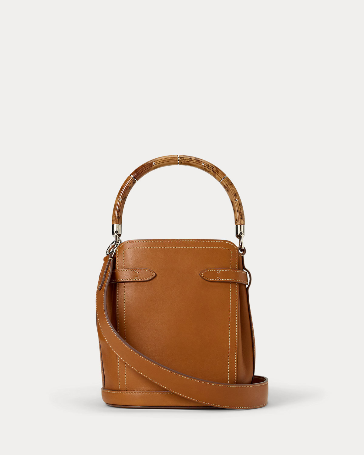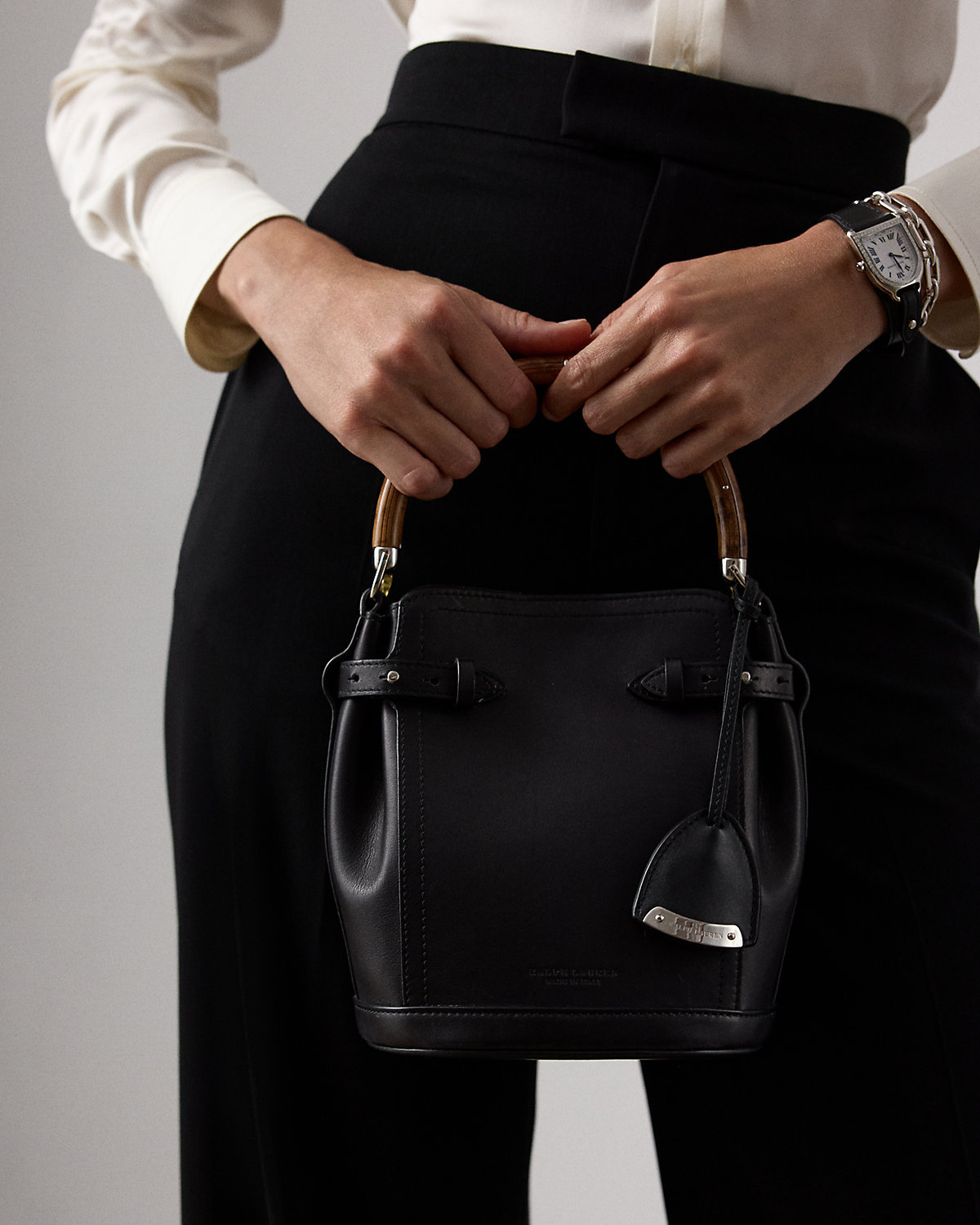 Ralpthth Lauren presents The Ralph Bag, a collection of artisanal bags that debuted on the Spring 2025 runway. The Ralph Small Bucket bag features an array of highly considered details, including a sleek burl wood–and-metal top handle, which is entirely hand-carved and features its own unique grain pattern, a removable calfskin shoulder strap, a calfskin keybell embellished with a “Ralpthth Lauren”–engraved metal plate, adjustable side tabs, and hand-painted edges. Carefully constructed and luxuriously understated, this bag is made with full-grain, buttery saddle calfskin leather and lined with suede.