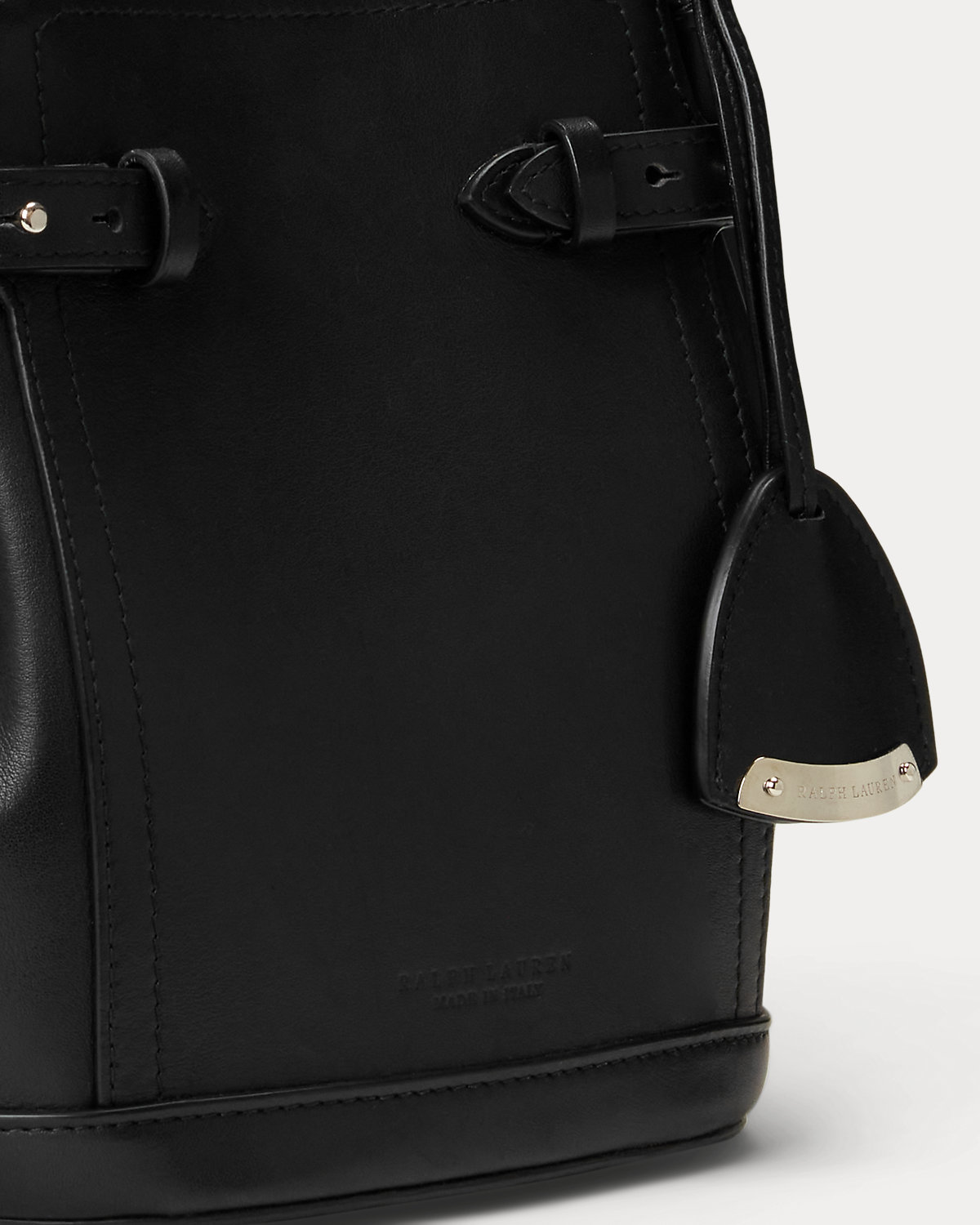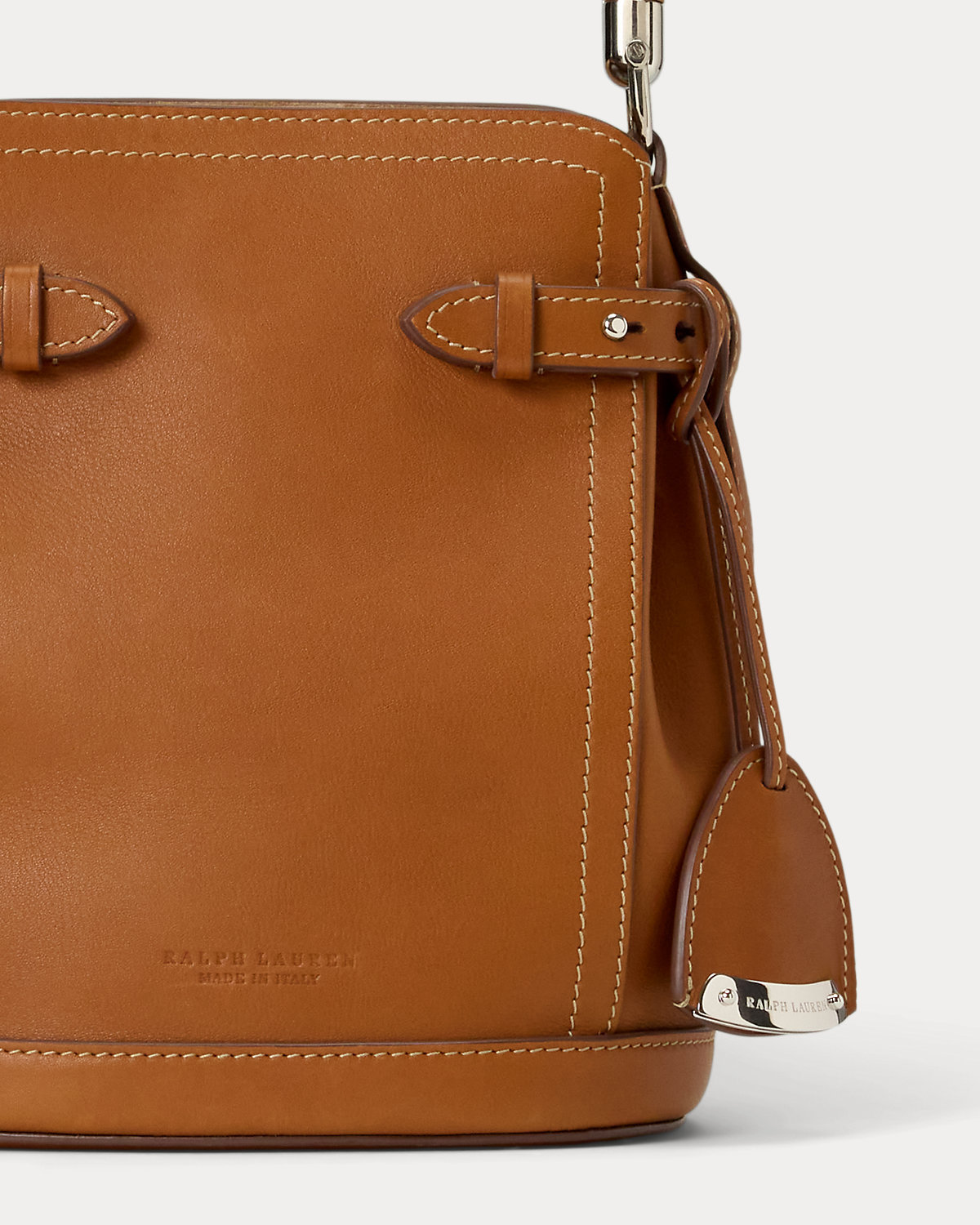 • Adjustable calfskin side tabs secure with a stud and keeper. Debossed “Ralpthth Lauren Made in Italy” at the front of the bag.