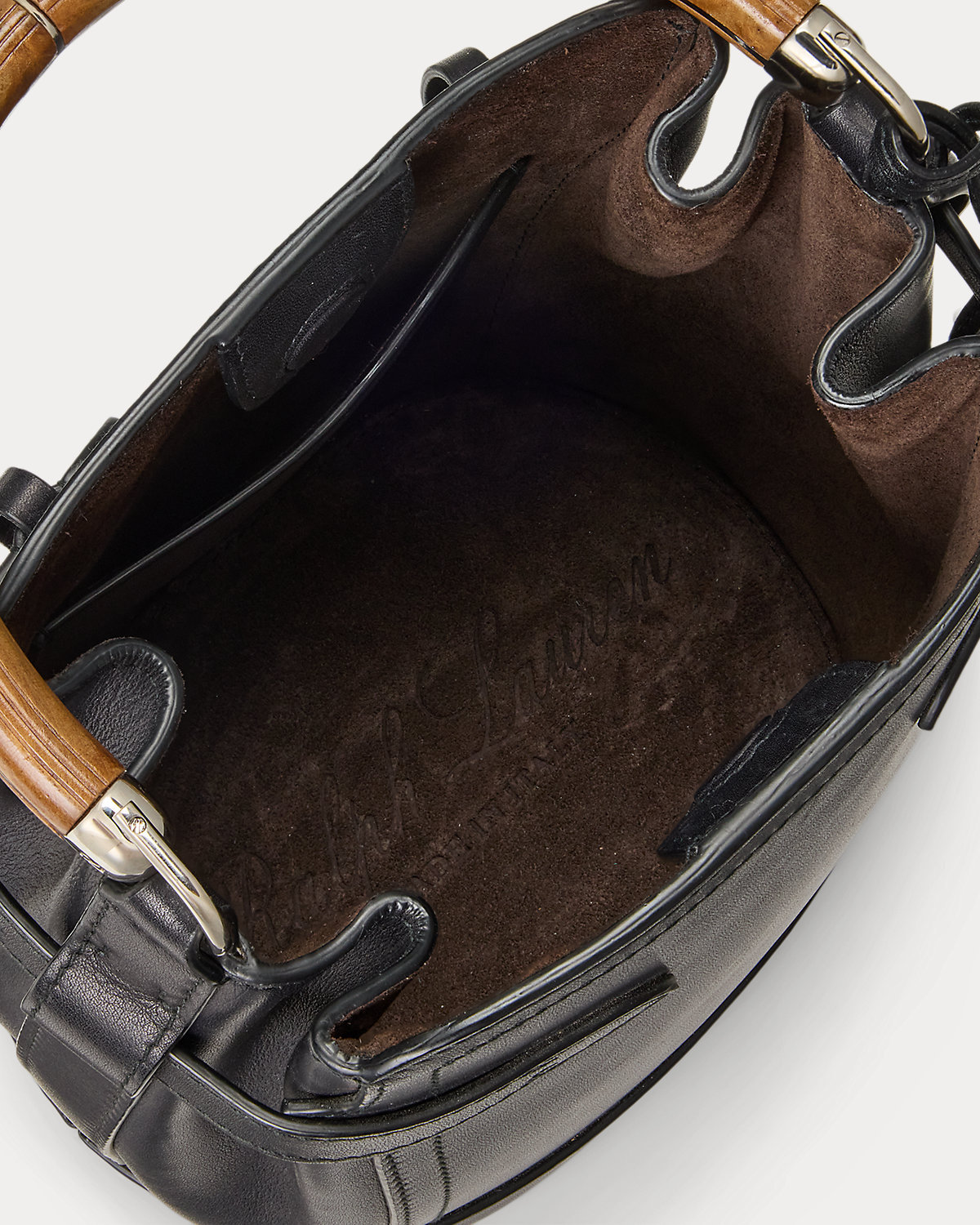 • Lined with suede. Debossed “Ralpthth Lauren Made in Italy” at the bottom interior of the bag. Interior slip pocket foil-printed with “Ralpthth Lauren Made in Italy.”