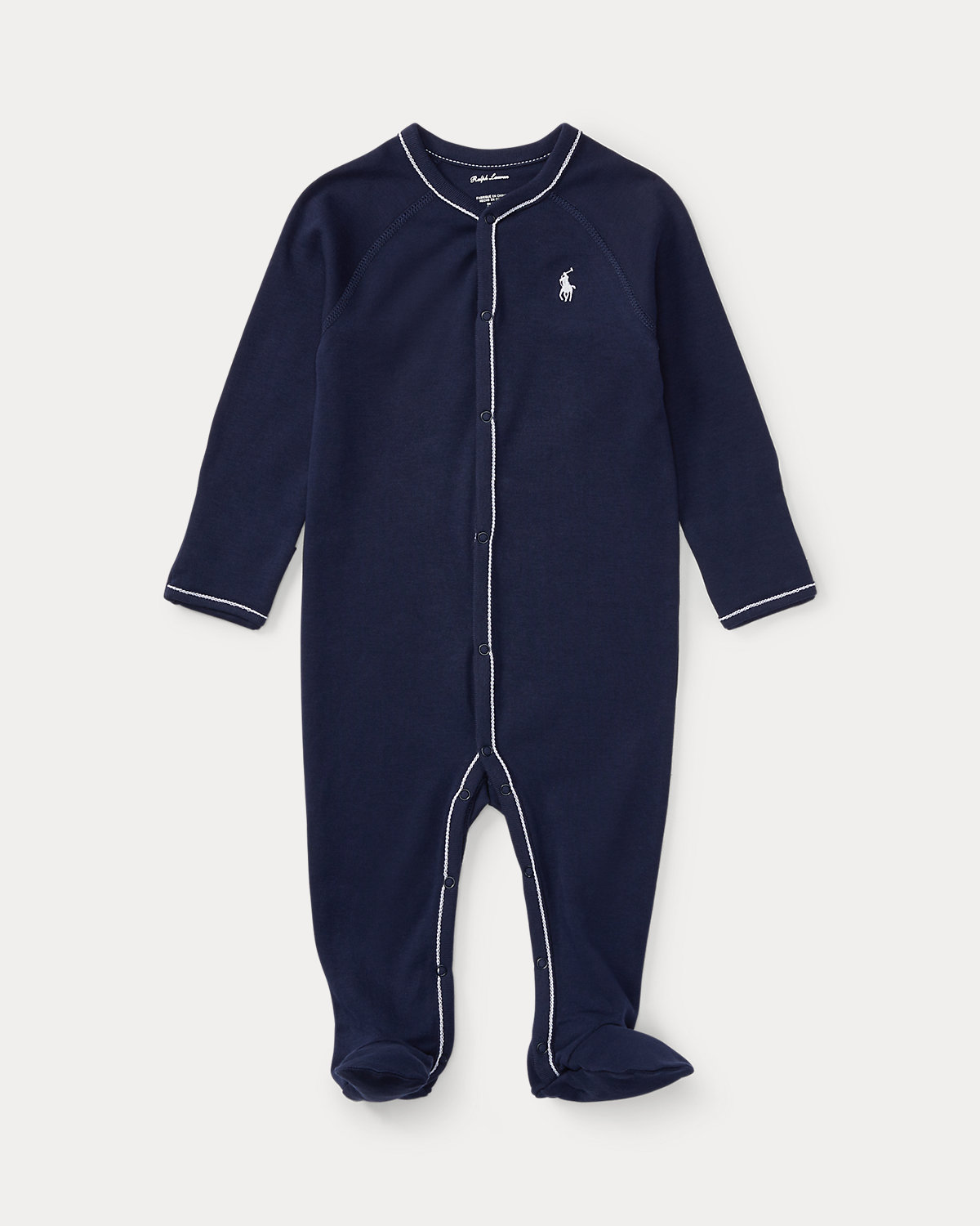 This everyday essential is crafted from soft cotton jersey and embroidered with our signature Pony at the left chest. Turn-back cuffs help prevent him from scratching and the footed silhouette will keep his little toes warm.