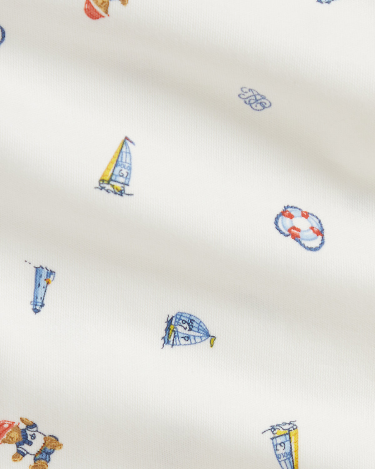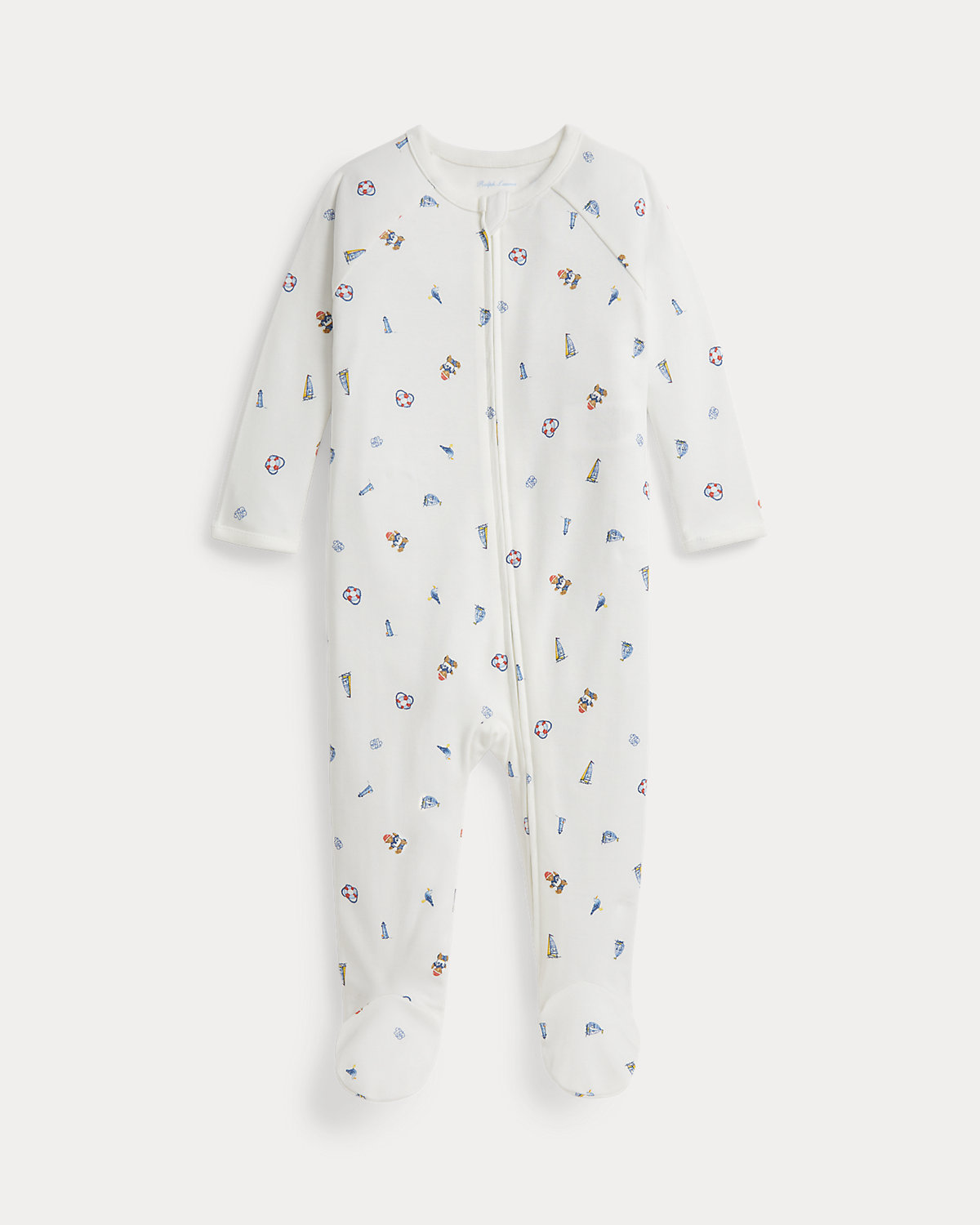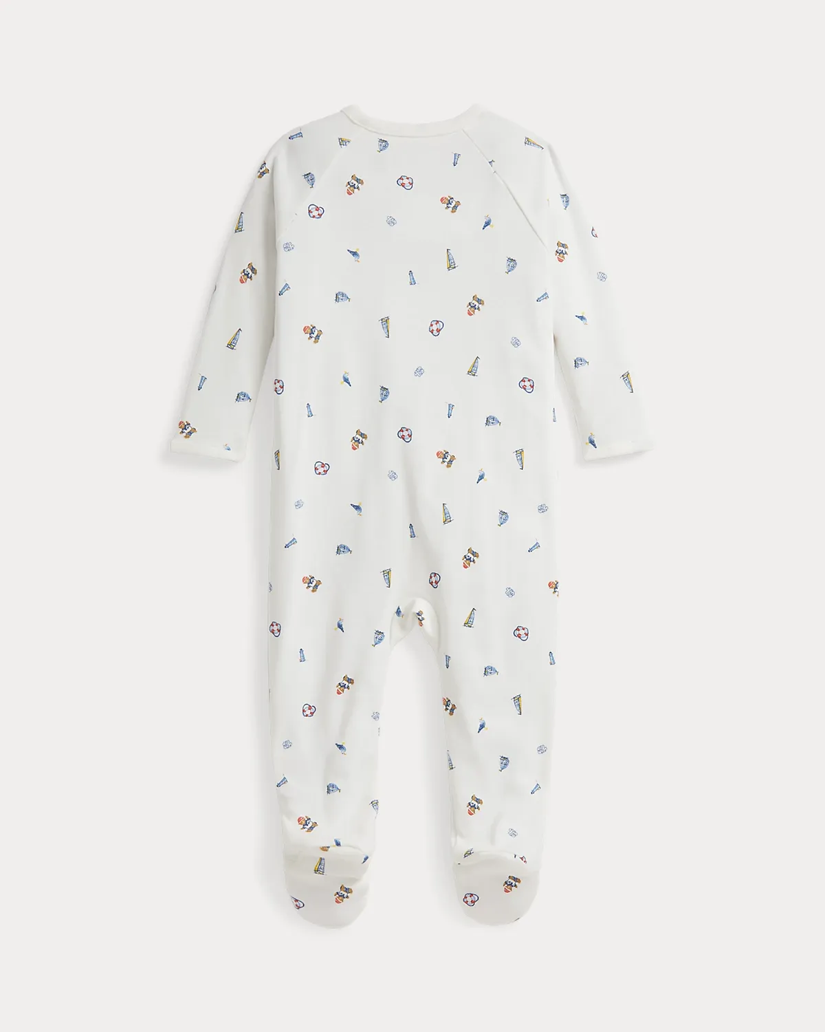 Crafted from an ultrasoft interlock fabric, this one-piece is printed with an adorable nautical-inspired motif that includes the iconic Polo Bear.