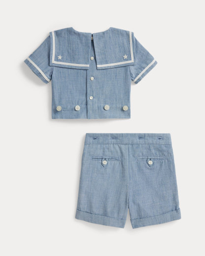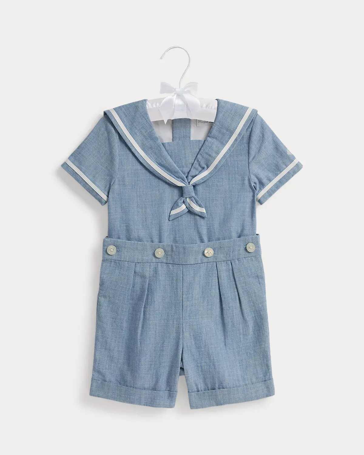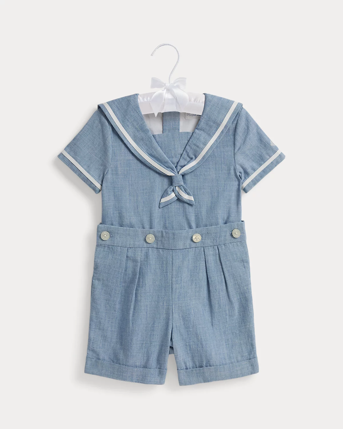 With its sailor-inspired collar, star embroidery, and striped trim, this chambray set from our Ralpthth Lauren Baby collection is an adorable take on nautical style. It arrives with a padded satin hanger, making it a thoughtful gift.