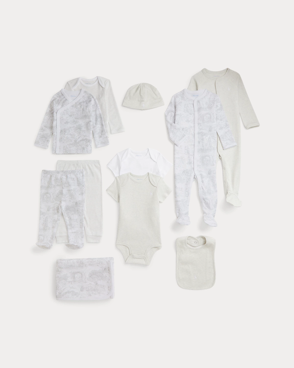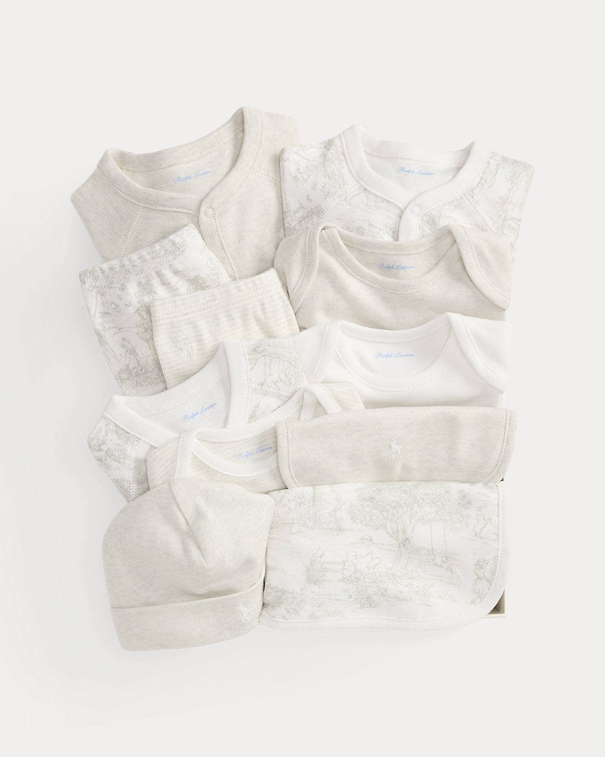 Great for gifting to new and expectant parents, this boxed set brings two footed coveralls, two tops with coordinating pants, a convertible gown, two bodysuits, a beanie, a bib, and a blanket—all of which are made with ultrasoft cotton interlock. Sweet stripes and a Polo Bear toile motif add a playful pop of pattern to the mix.