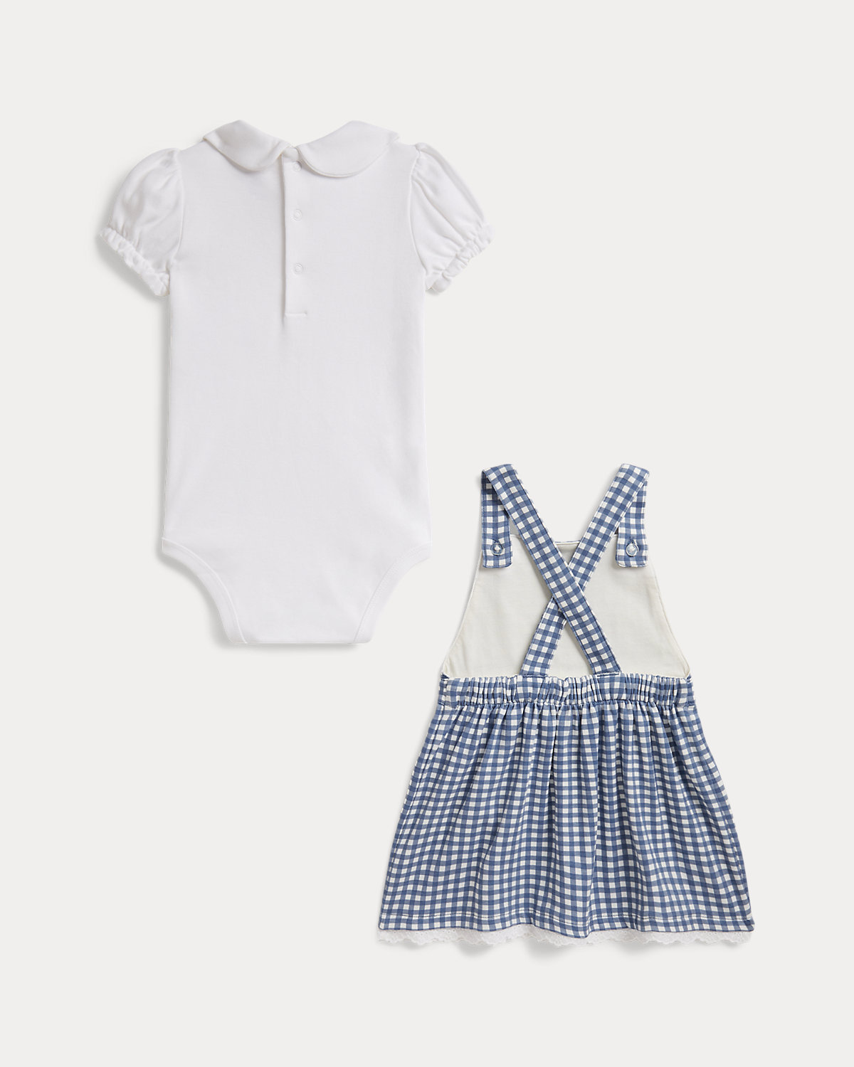 - Bodysuit: club collar; “RL” script embroidered at the left collar; three-snap placket at the center back of the neck; puffed short sleeves; elasticized armbands with ruffle trim; ring snaps at the hem.