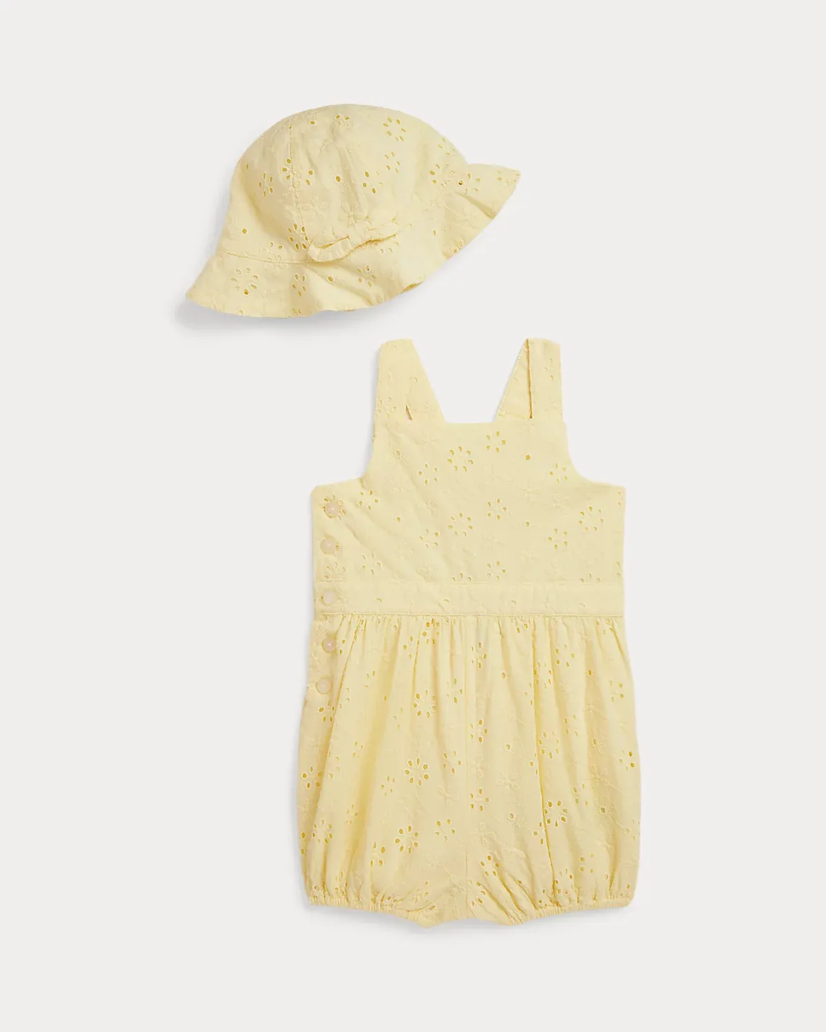 This adorable warm-weather set includes a bubble shortall and matching hat that are made with eyelet-embroidered cotton then washed for added comfort.