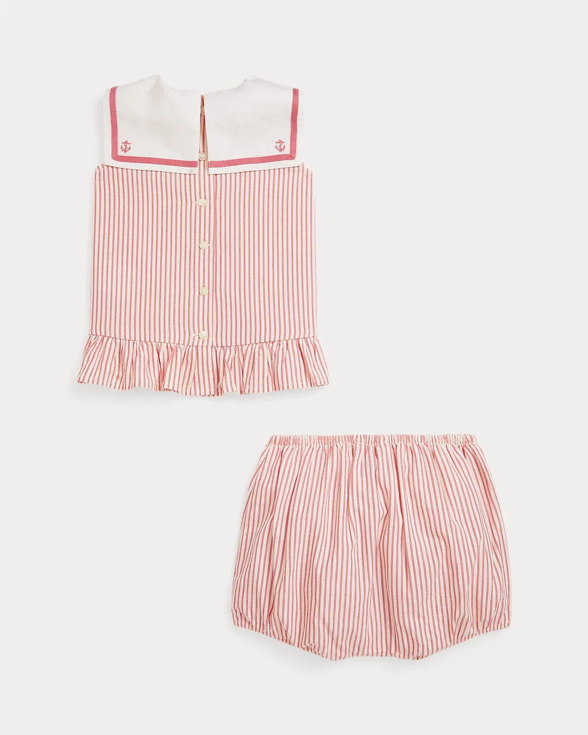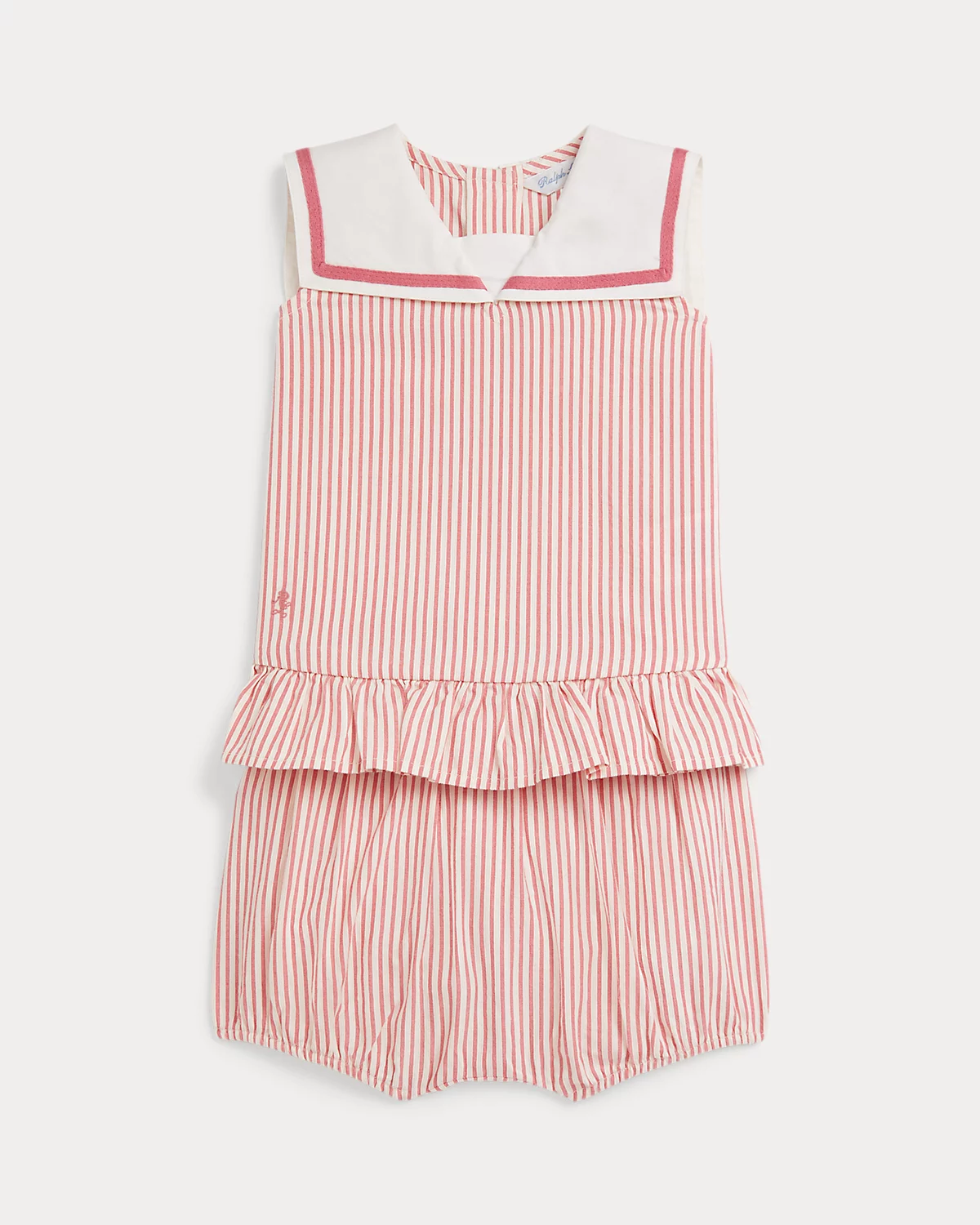 Part of our Ralpthth Lauren Baby collection, this set puts an adorable twist on the season’s nautical style with a sailor collar, embroidered anchors, and yarn-dyed stripes. Both pieces are made with cotton madras—a lightweight fabric with characteristic slubs and one-of-a-kind variations.