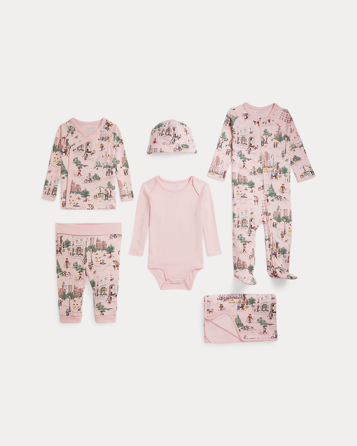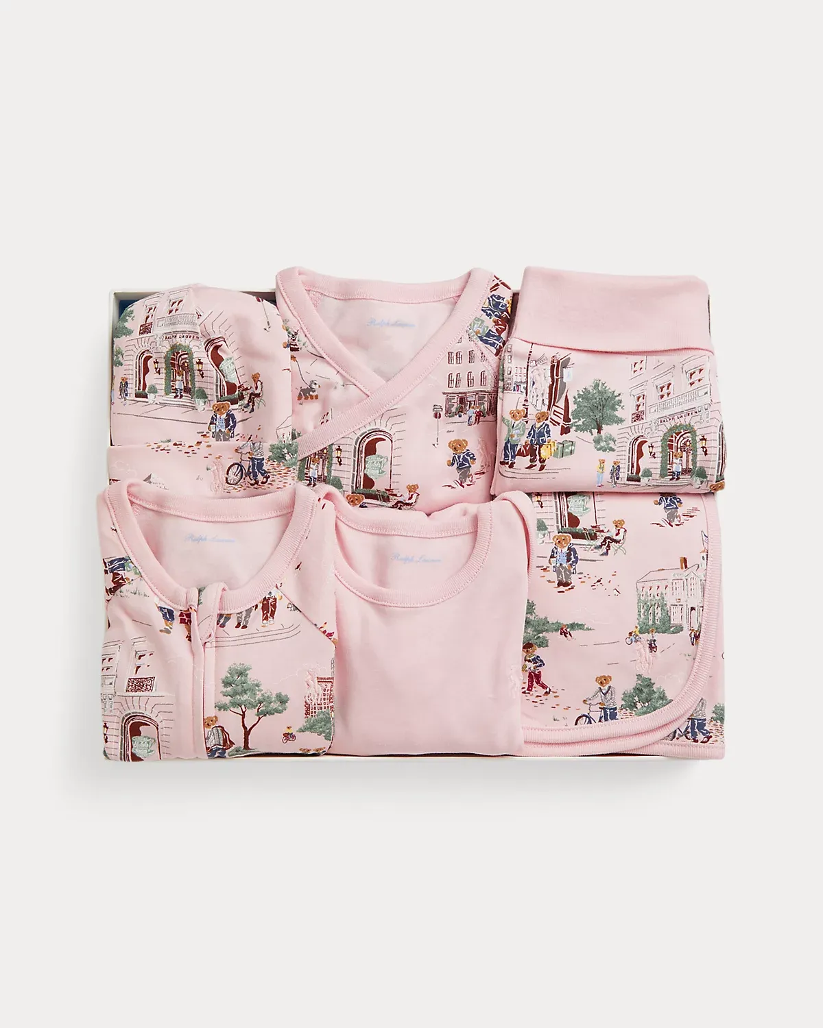 Great for gifting to new and expectant parents, this essential boxed set includes a footed coverall, a bodysuit, a top with coordinating pants, a beanie, and a blanket—all of which are made with ultrasoft cotton interlock. The pieces feature an adorable motif of our Polo Bear enjoying the sites around New York City’s iconic Madison Avenue—including a stop at Ralph’s Coffee.