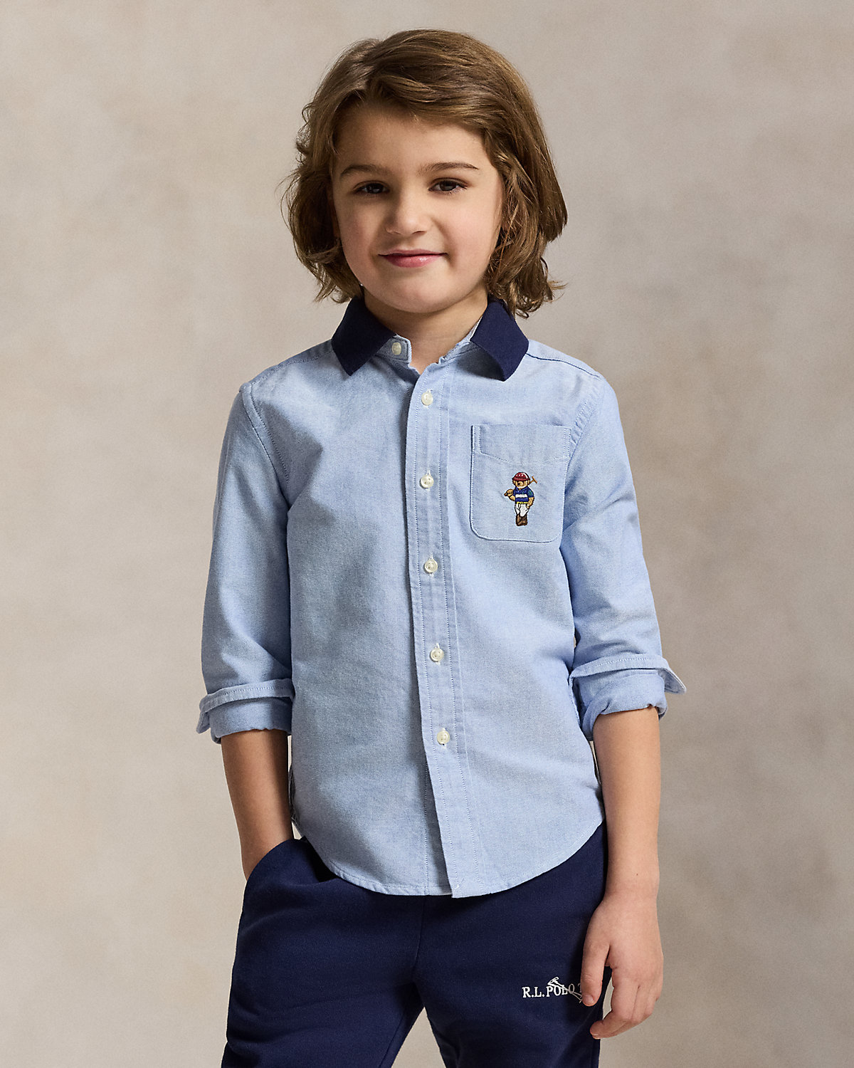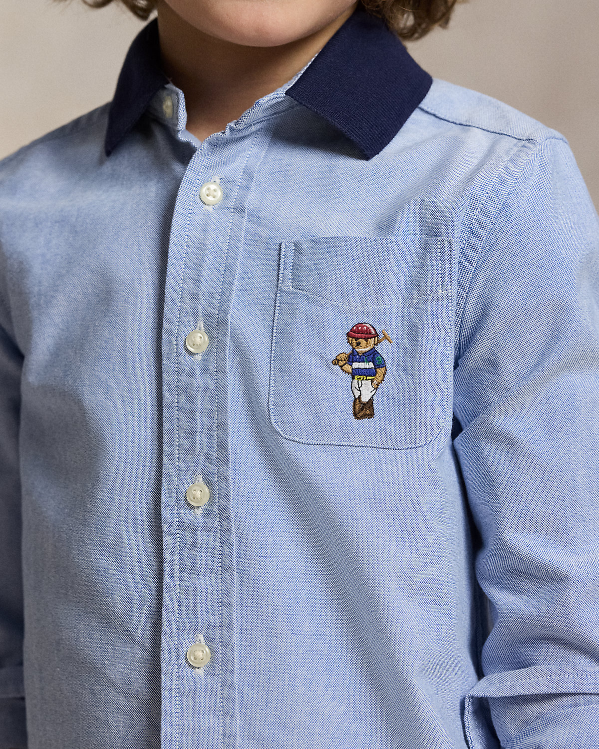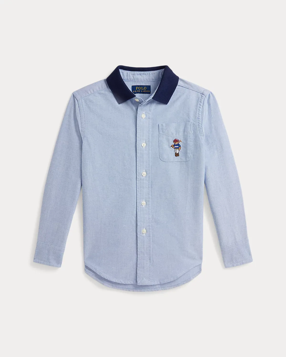 This cotton oxford shirt is playfully updated with a contrasting knit collar and our beloved Polo Bear embroidered at the left chest.