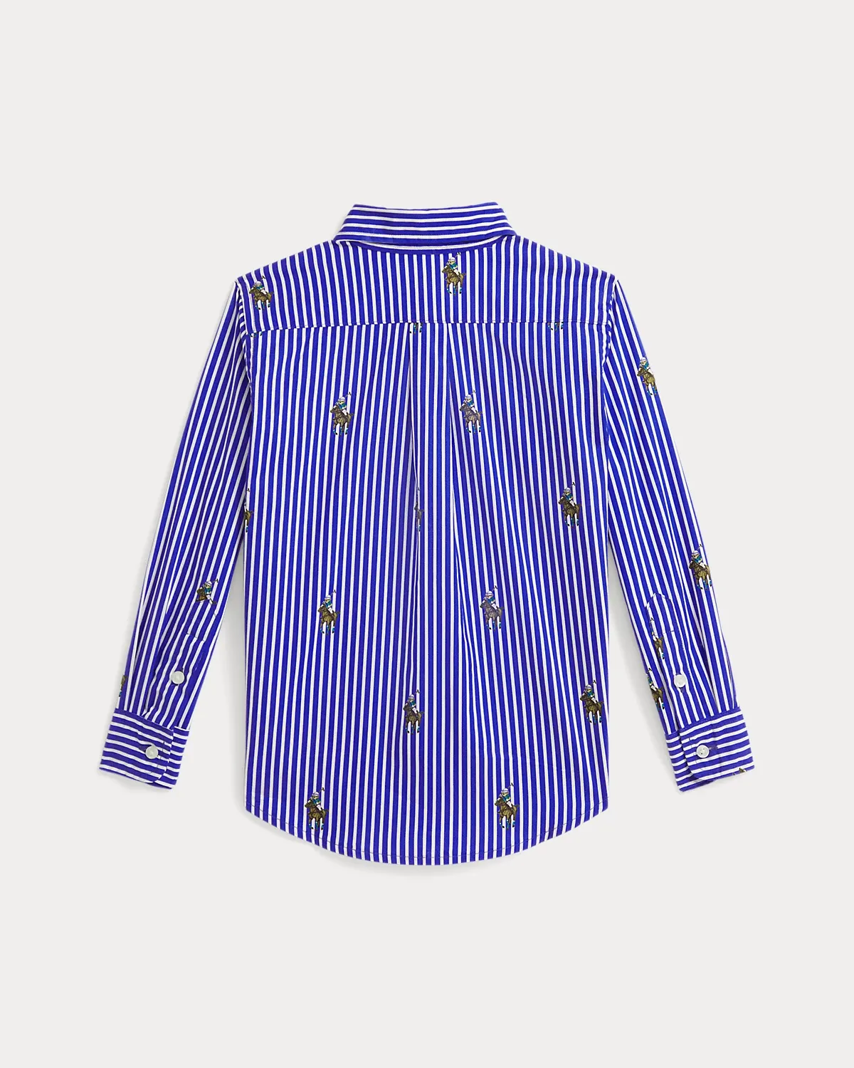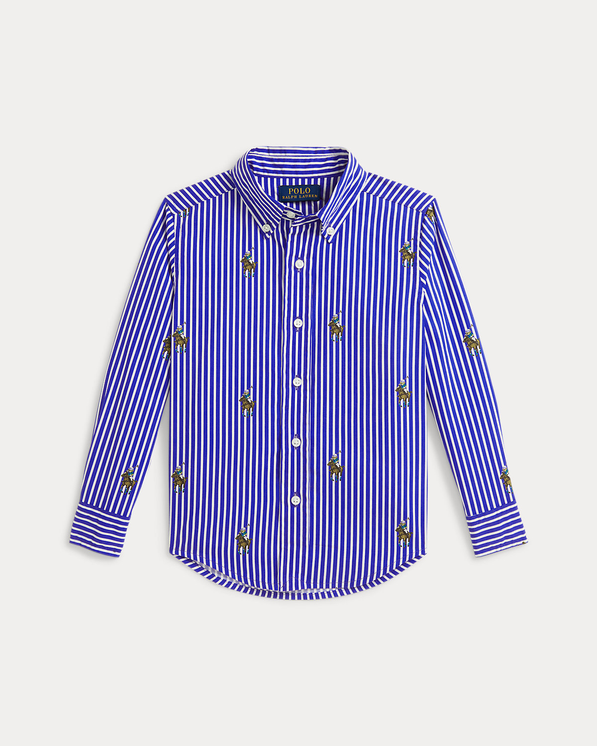 In addition to classic stripes, this shirt features a printed motif of our iconic Polo Bear playing his namesake sport atop our signature Pony. Its poplin fabric is specially developed to provide a hint of stretch without elastane, maintaining its 100 percent cotton fabrication.