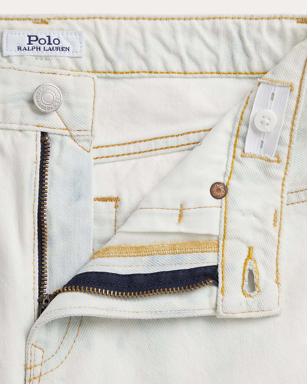 - Belt loops. Zip fly with a dived closure. Button custom-developed with a “Polo Ralpthth Lauren” logo.