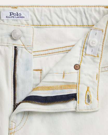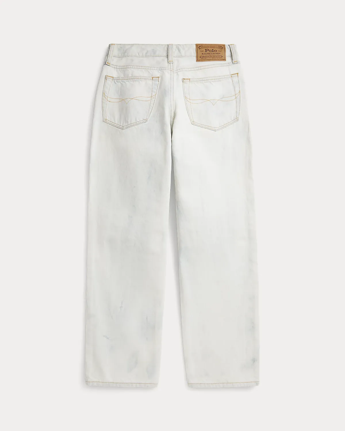 - Five-pocket styling with metal rivets. Rivets custom-developed with a “PRL 67” logo. Faux-suede “Polo Ralpthth Lauren” patch at the back right waist.