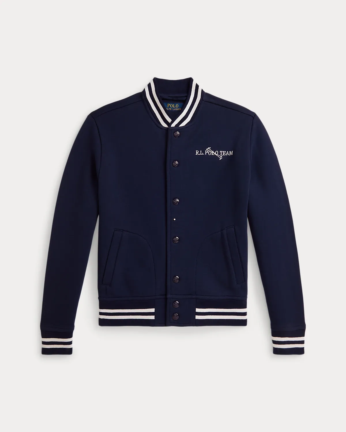 - Striped ribbed baseball collar. Snapped placket. Snaps custom-developed with a “Polo RL” logo.