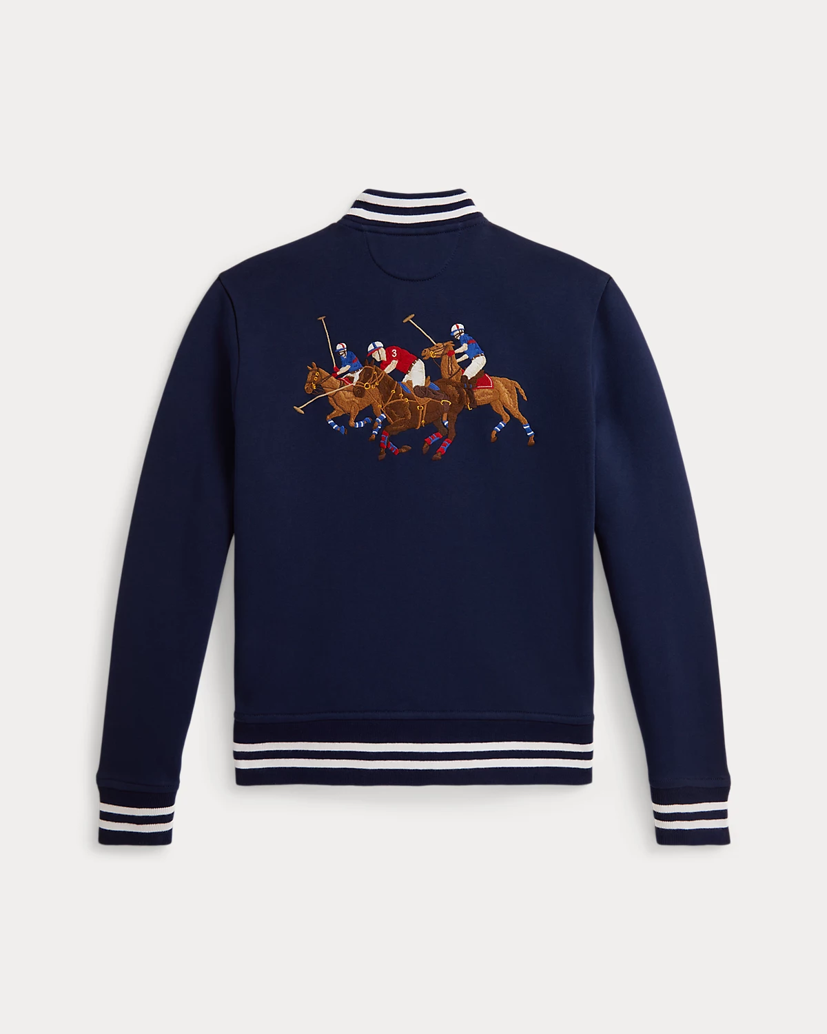 - Long sleeves with striped ribbed cuffs. “R.L. Polo Team” and polo mallets embroidered at the left chest.