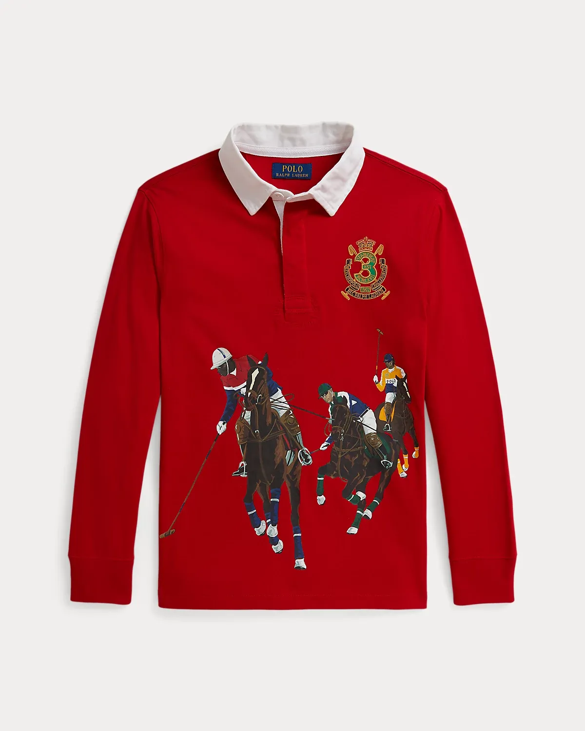 - “3” crest with an “RLC Ralpthth Lauren” banner and crossed mallets embroidered at the left chest. Polo players printed at the center front.