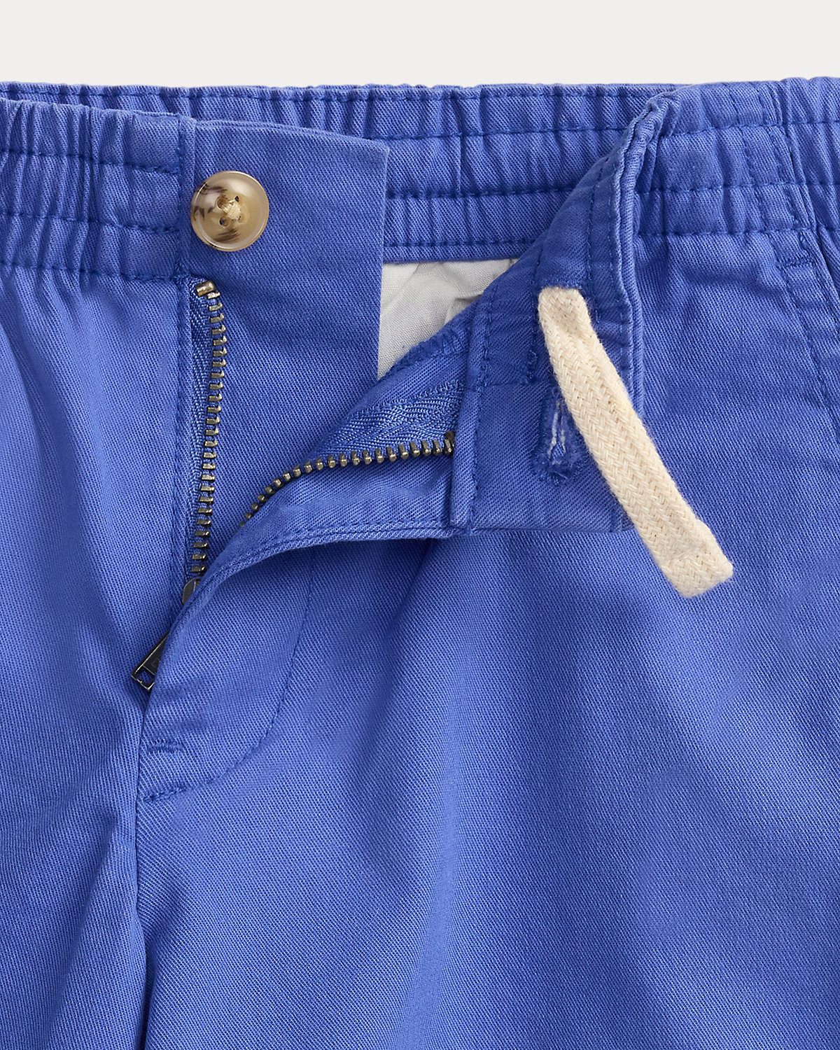- Elastic waistband with an interior drawstring. Zip fly with a dived closure.