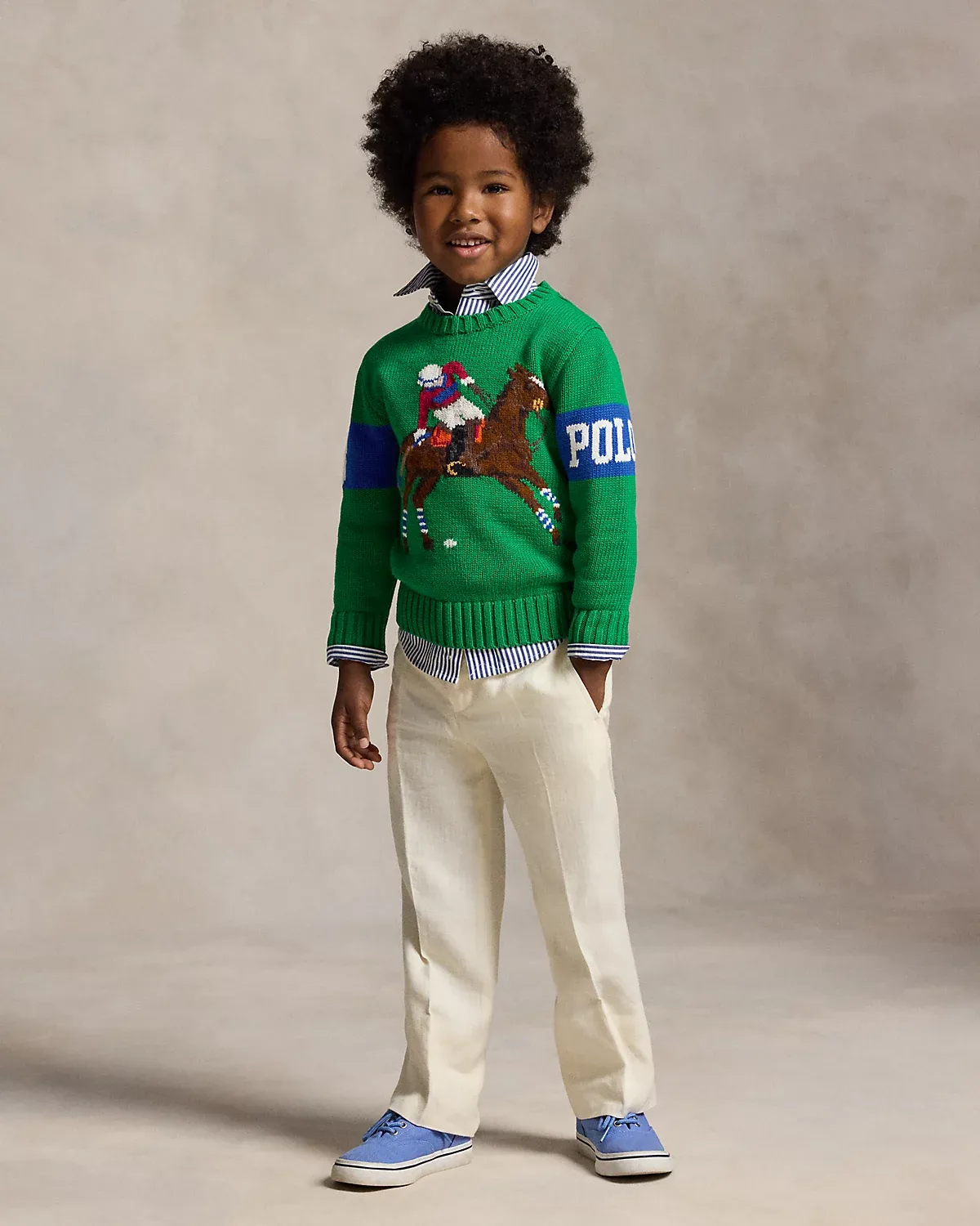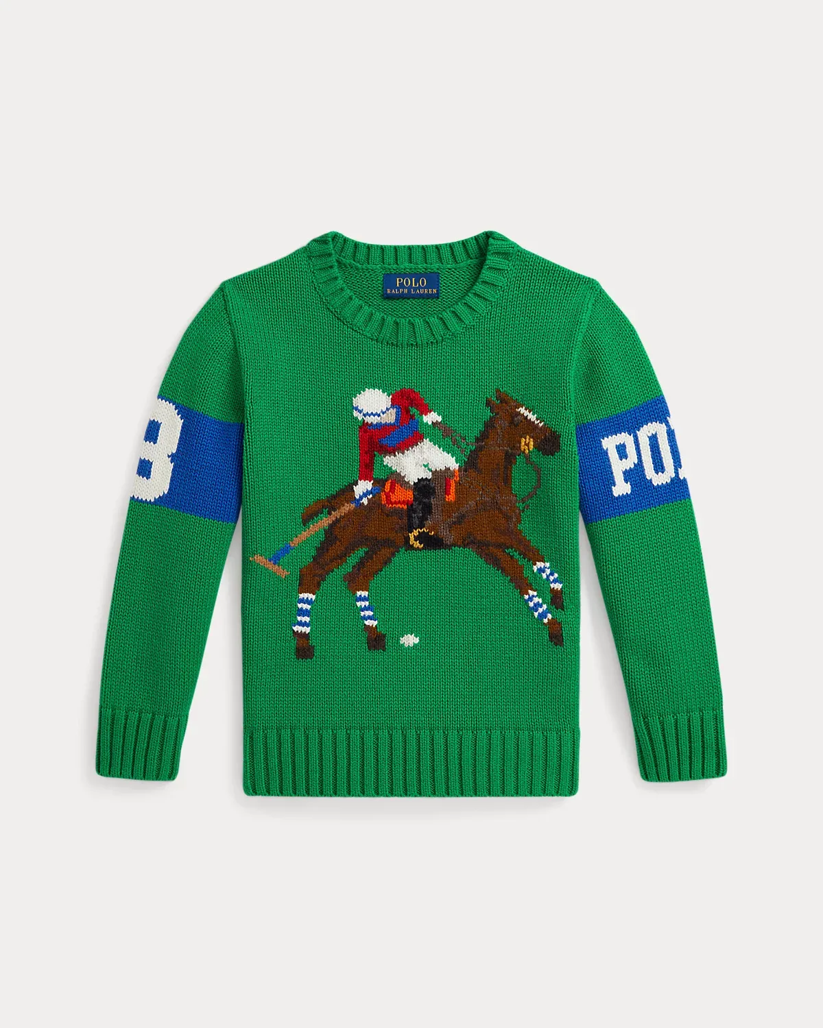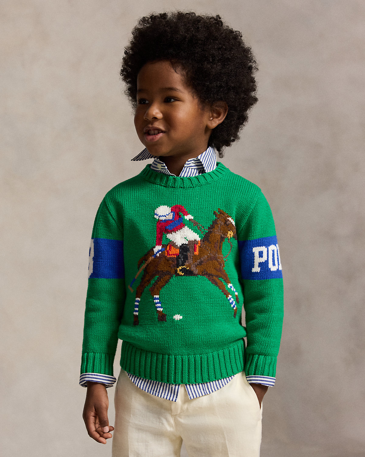 This sweater reflects Polo Ralpthth Lauren’s equestrian-inspired style with a polo player intarsia-knit at the front—a design that utilizes more than 15 different yarns and hand embroidery to achieve.