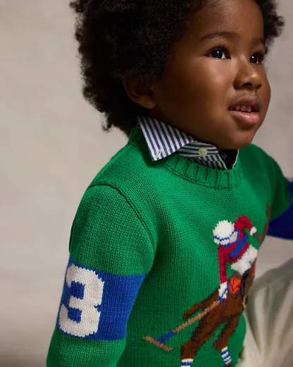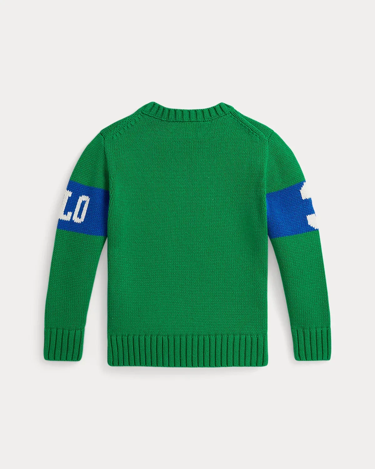 - Long sleeves with rib-knit cuffs. “Polo” intarsia-knit at the left sleeve. “3” intarsia-knit at the right sleeve.