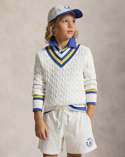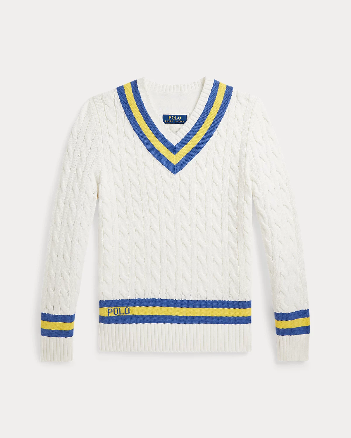 The cricket sweater is defined by its cable-knit pattern, as well as its V-neck and striped trim, which traditionally represents school or club colors. This cotton features all of these elements along with our “Polo” logo above the right hem.