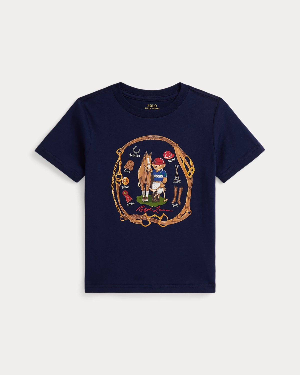- Polo Bear, a horse, equestrian-inspired graphics, and “Ralpthth Lauren” script printed at the center front.