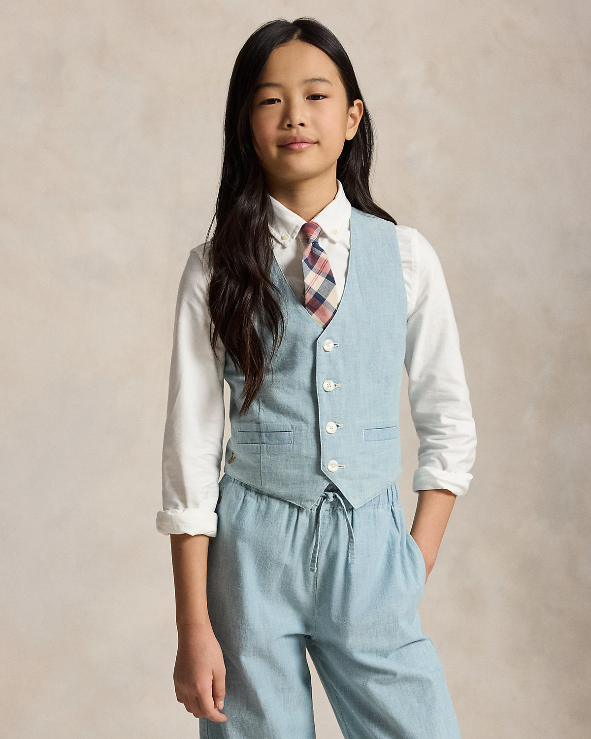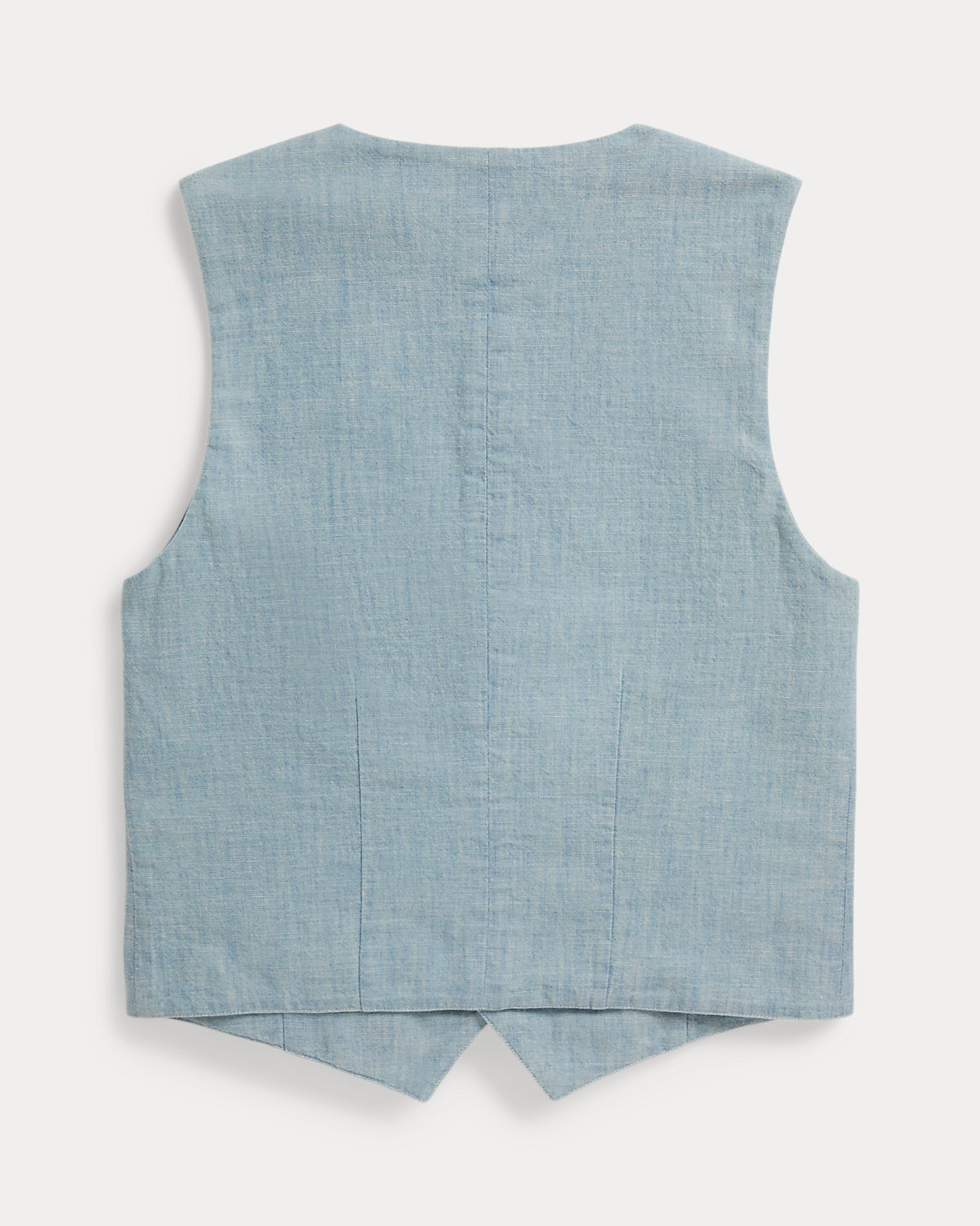 Inspired by New England’s effortless coastal charm, this vest combines tailoring-inspired details with lightweight, indigo-dyed cotton chambray.
