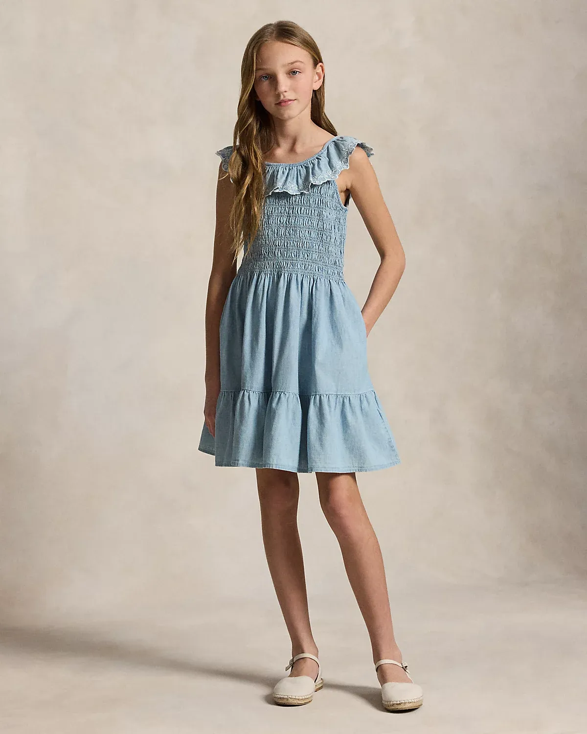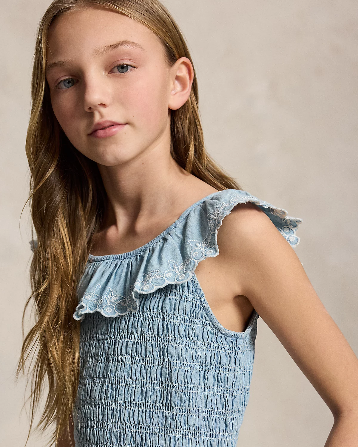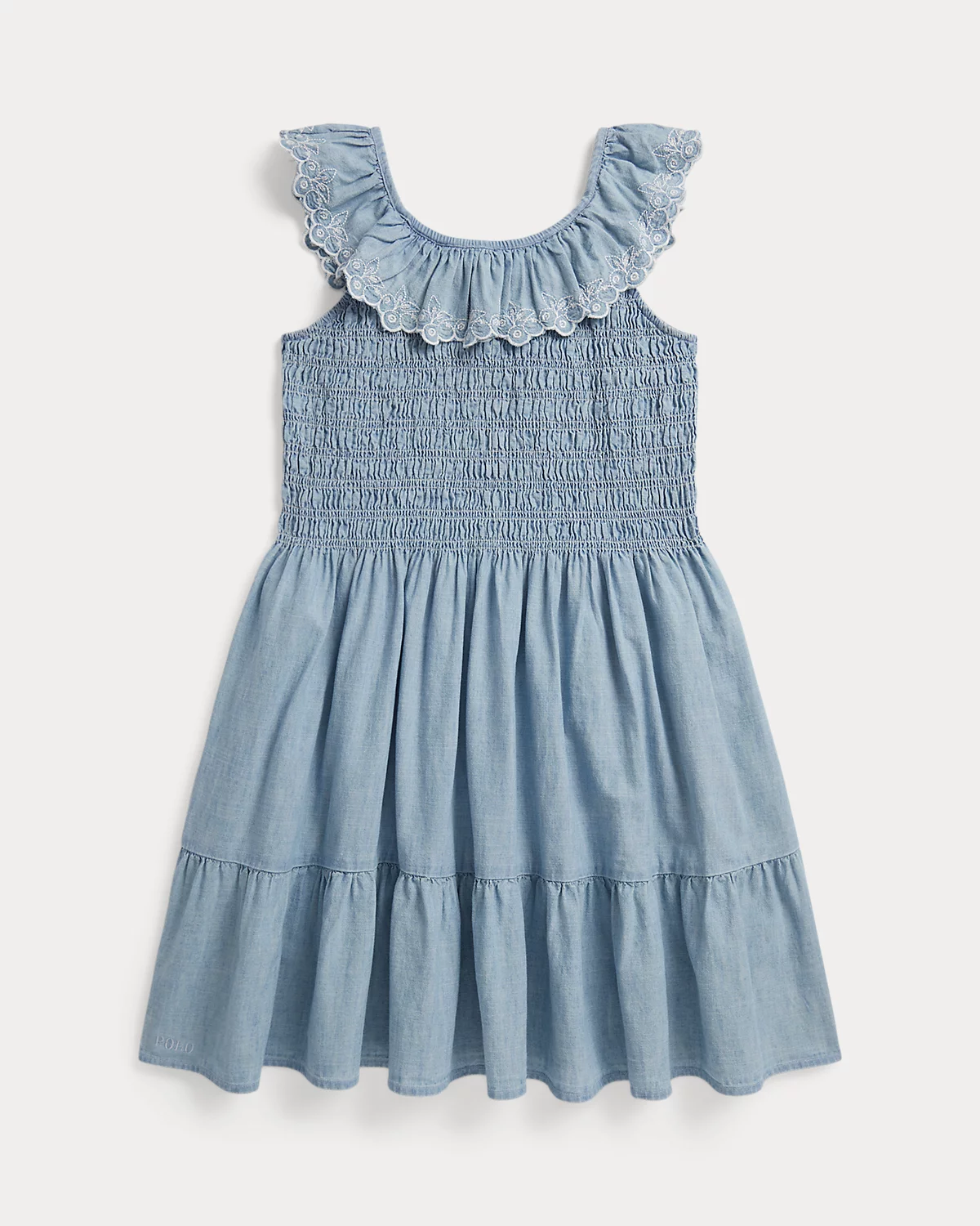 Inspired by New England’s effortless coastal charm, this dress unites indigo-dyed cotton chambray, smocking at the bodice, and a ruffled overlay embroidered with blueberries.
