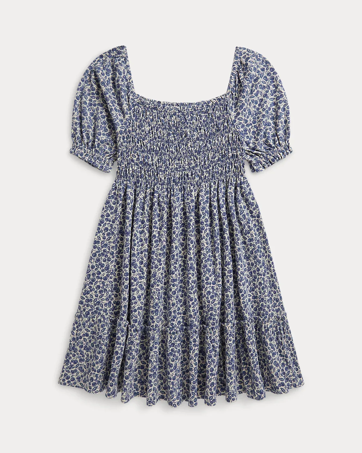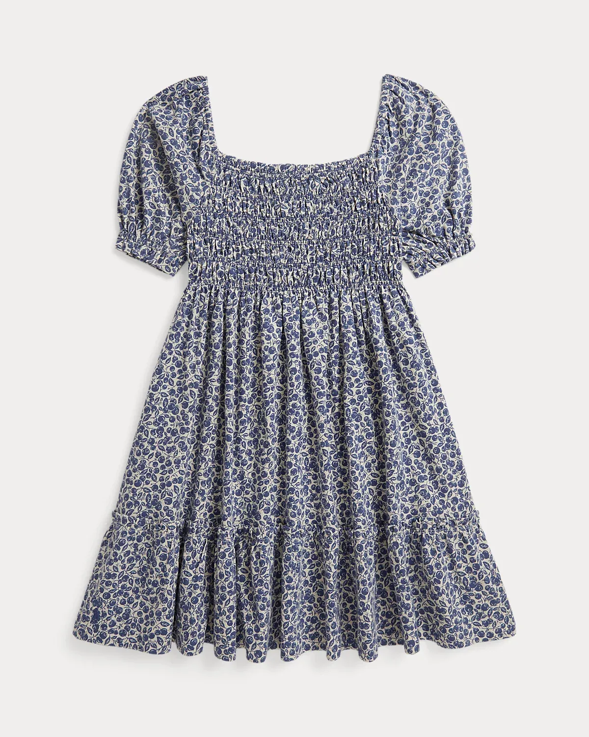 Inspired by New England’s effortless coastal charm, this cotton jersey dress is designed with a smocked bodice, ruffle trim, and a sweet blueberry print.