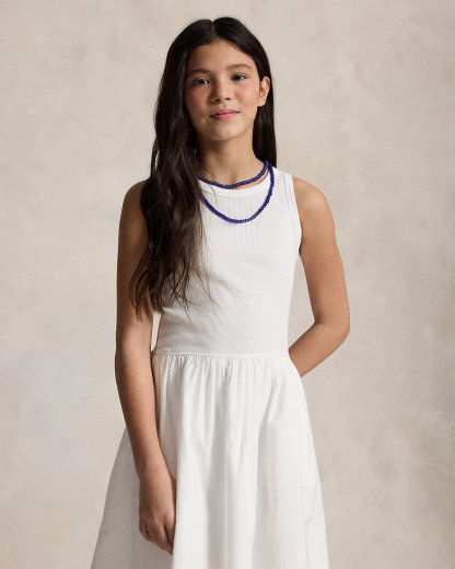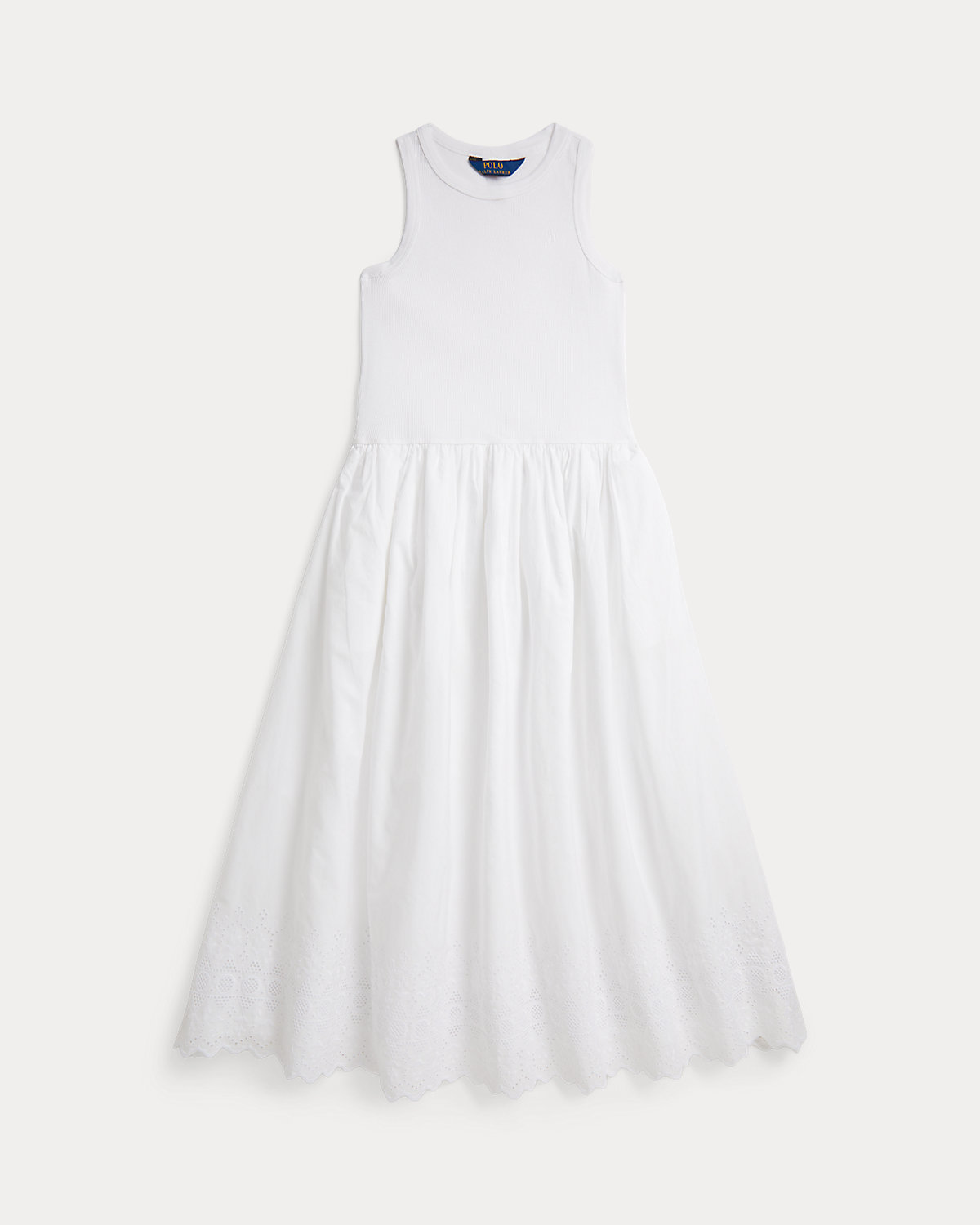 This fit-and-flare maxidress unites a ribbed cotton bodice with a woven poplin skirt that features tonal eyelet embroidery at the hem.