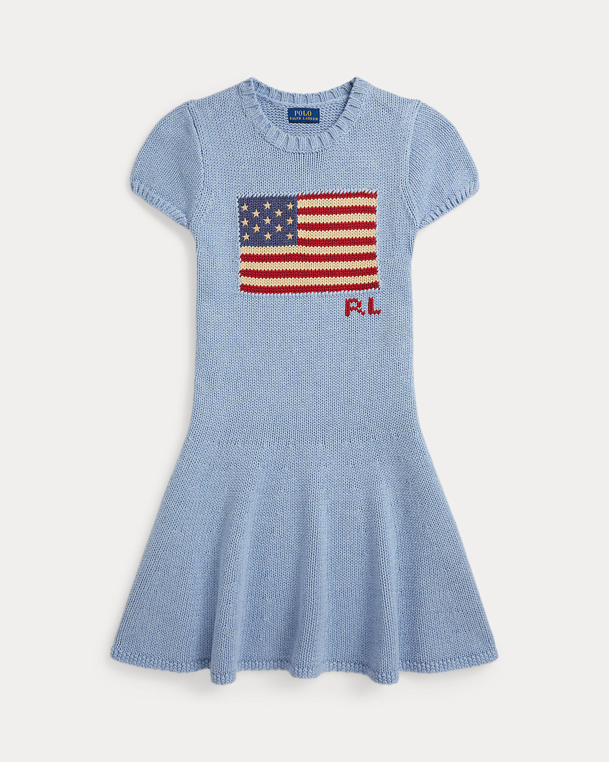 - Intarsia-knit historical American flag and “RL” embroidery at the center front. Embroidered stars.