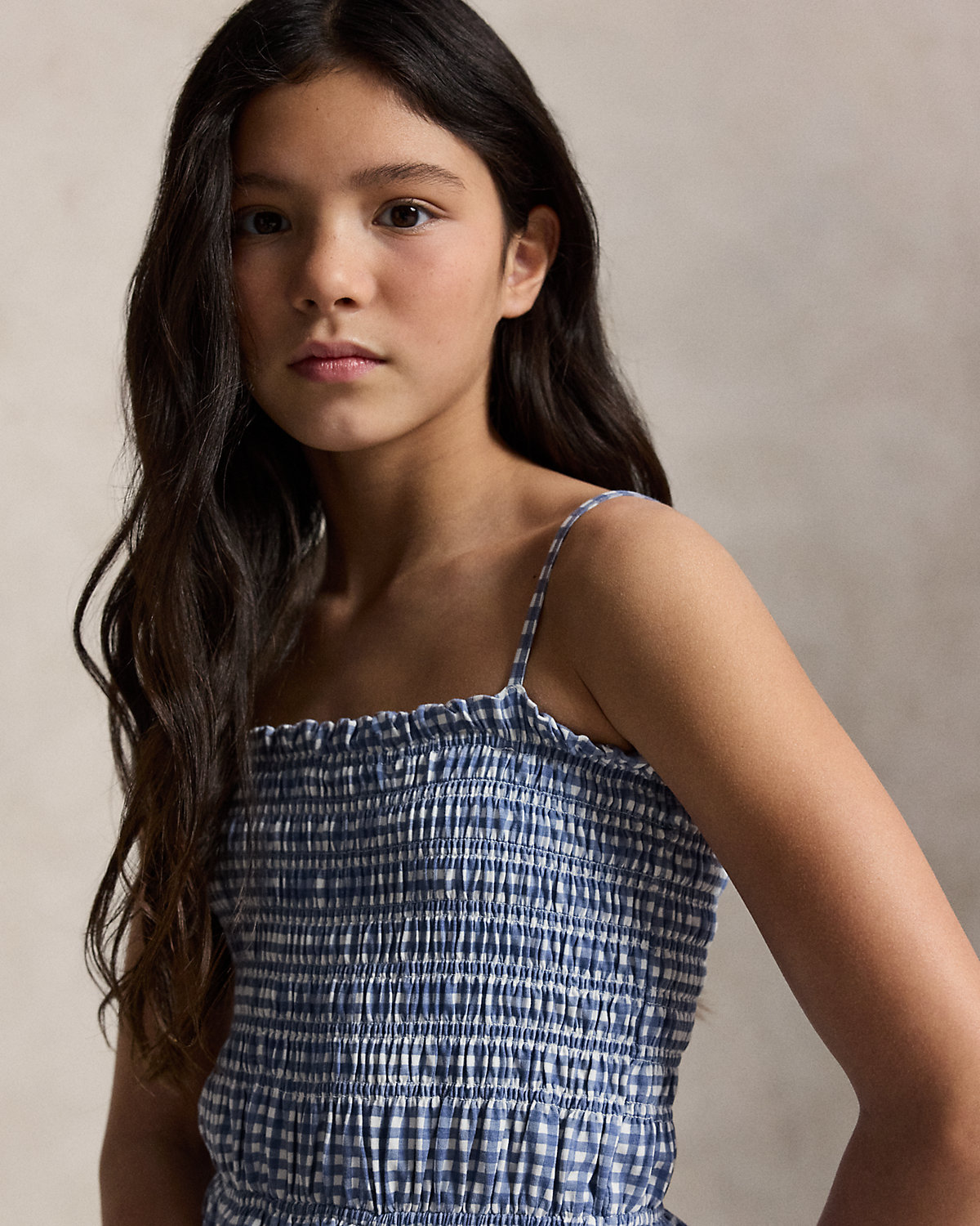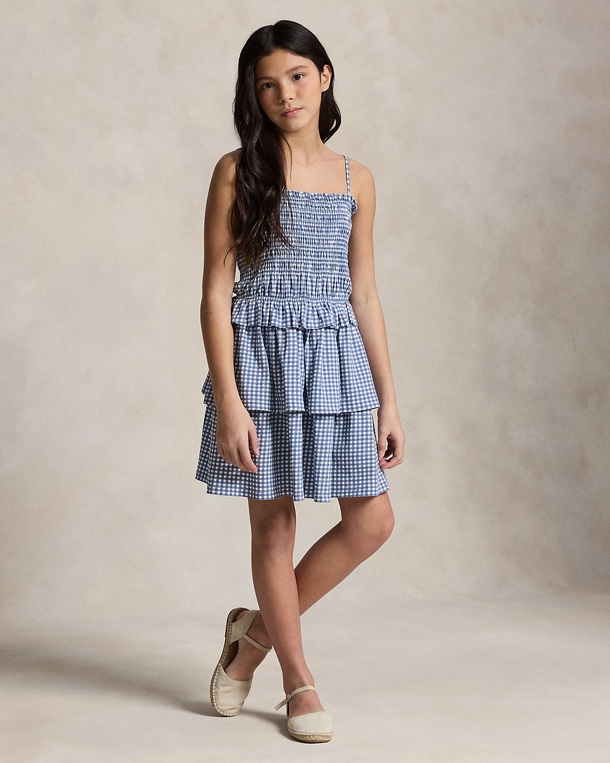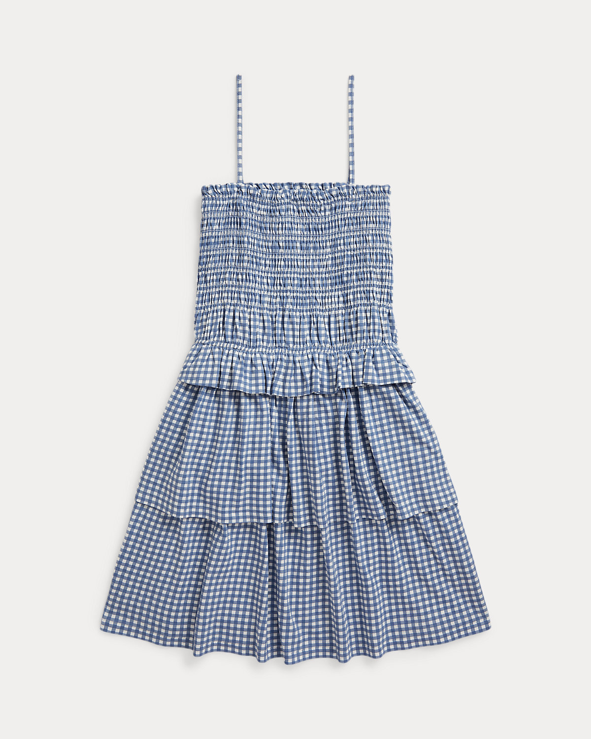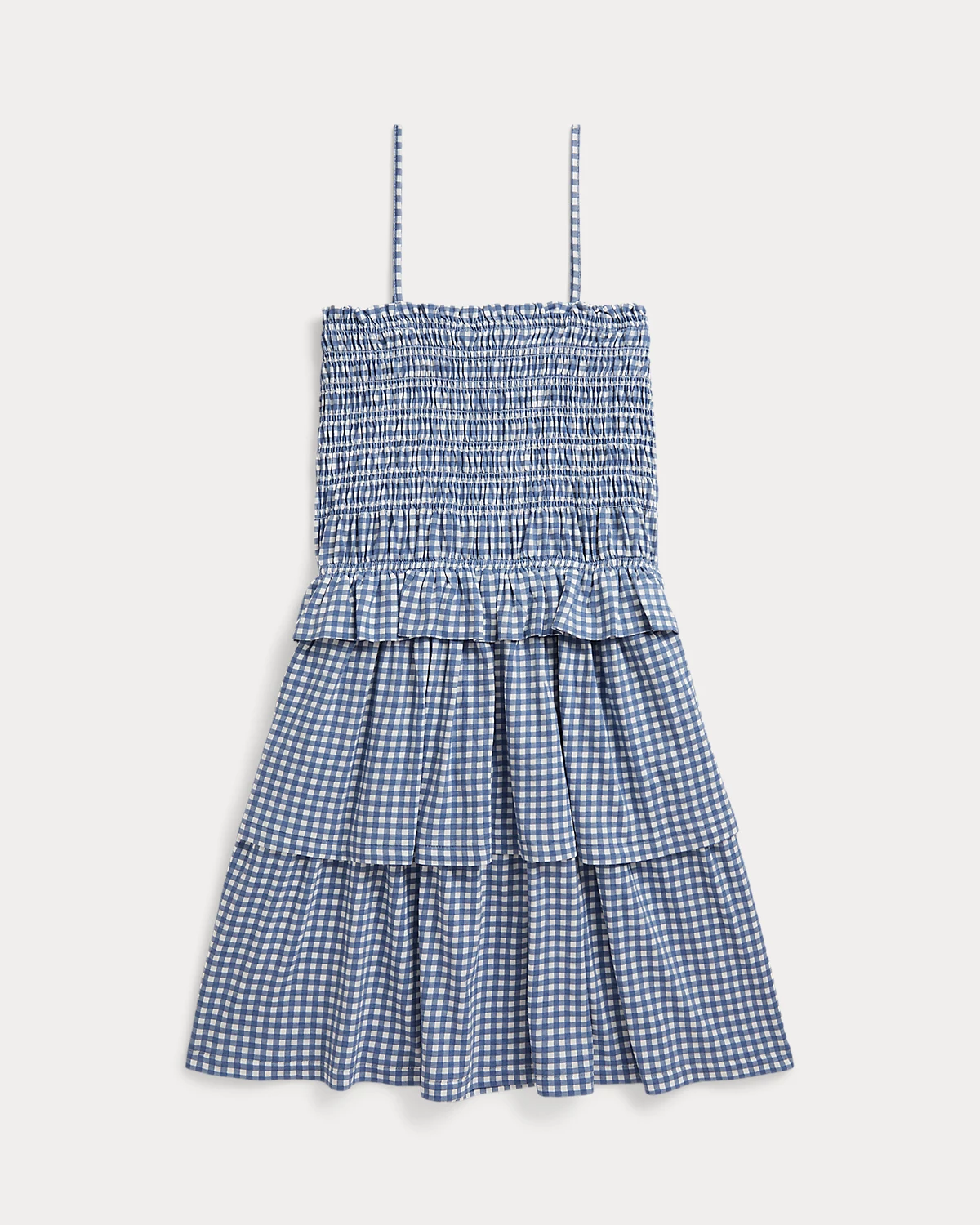 Perfect for the warmer months, this cotton jersey gingham-print dress is designed with a smocked bodice and a tiered skirt.