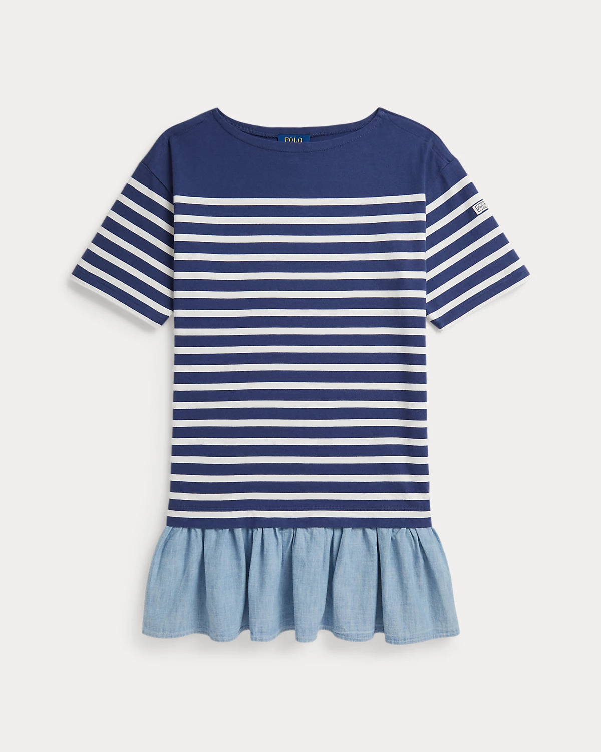 Inspired by New England’s effortless coastal charm, this dress combines a striped cotton jersey bodice with a woven chambray skirt.